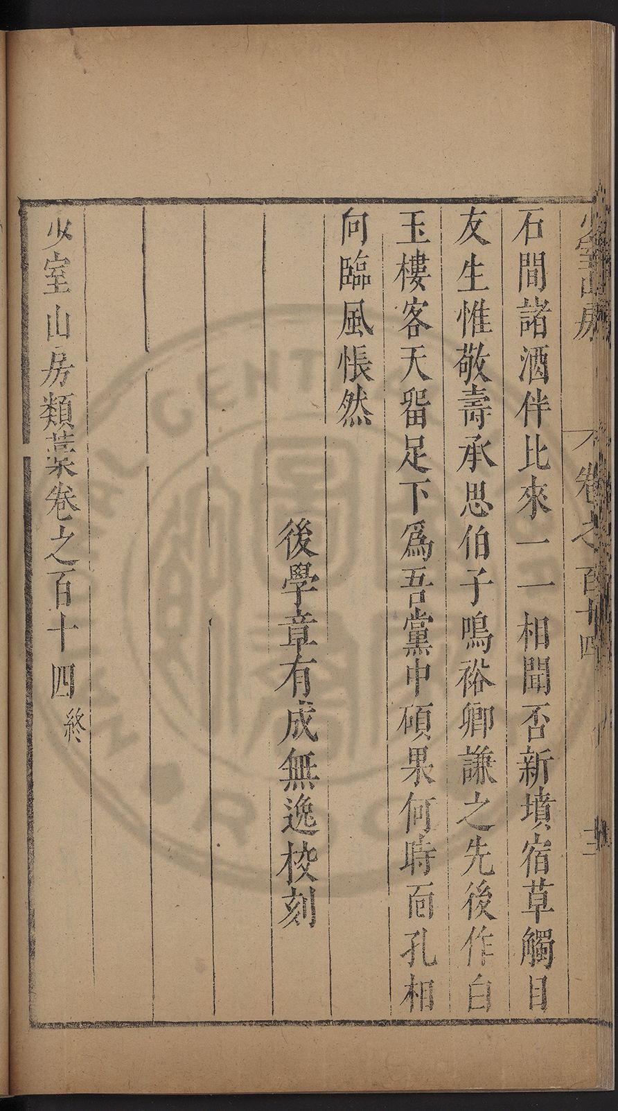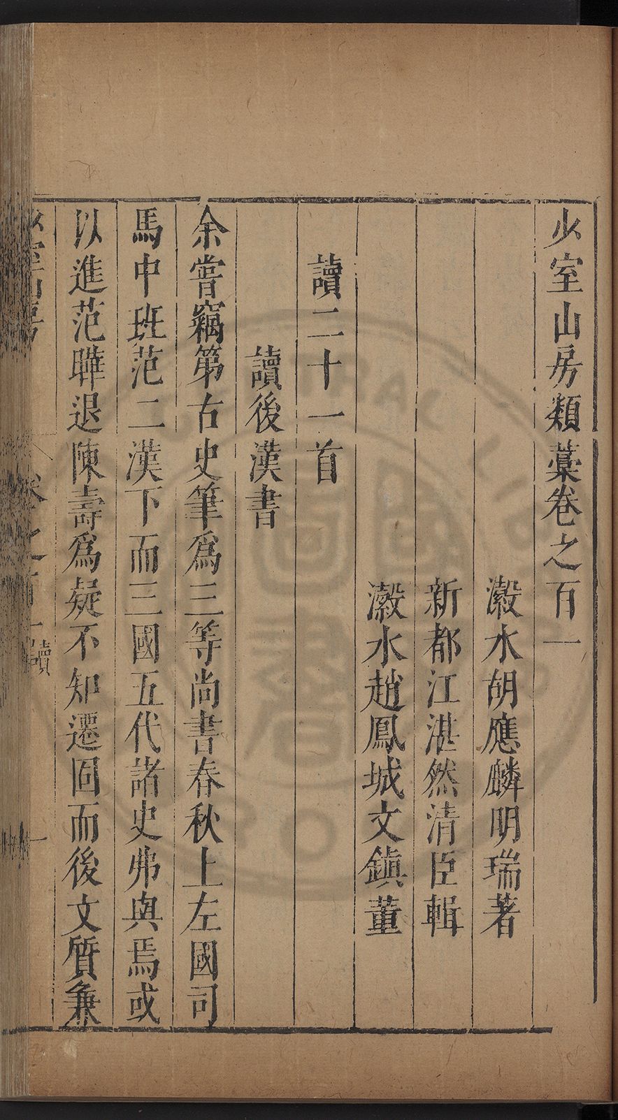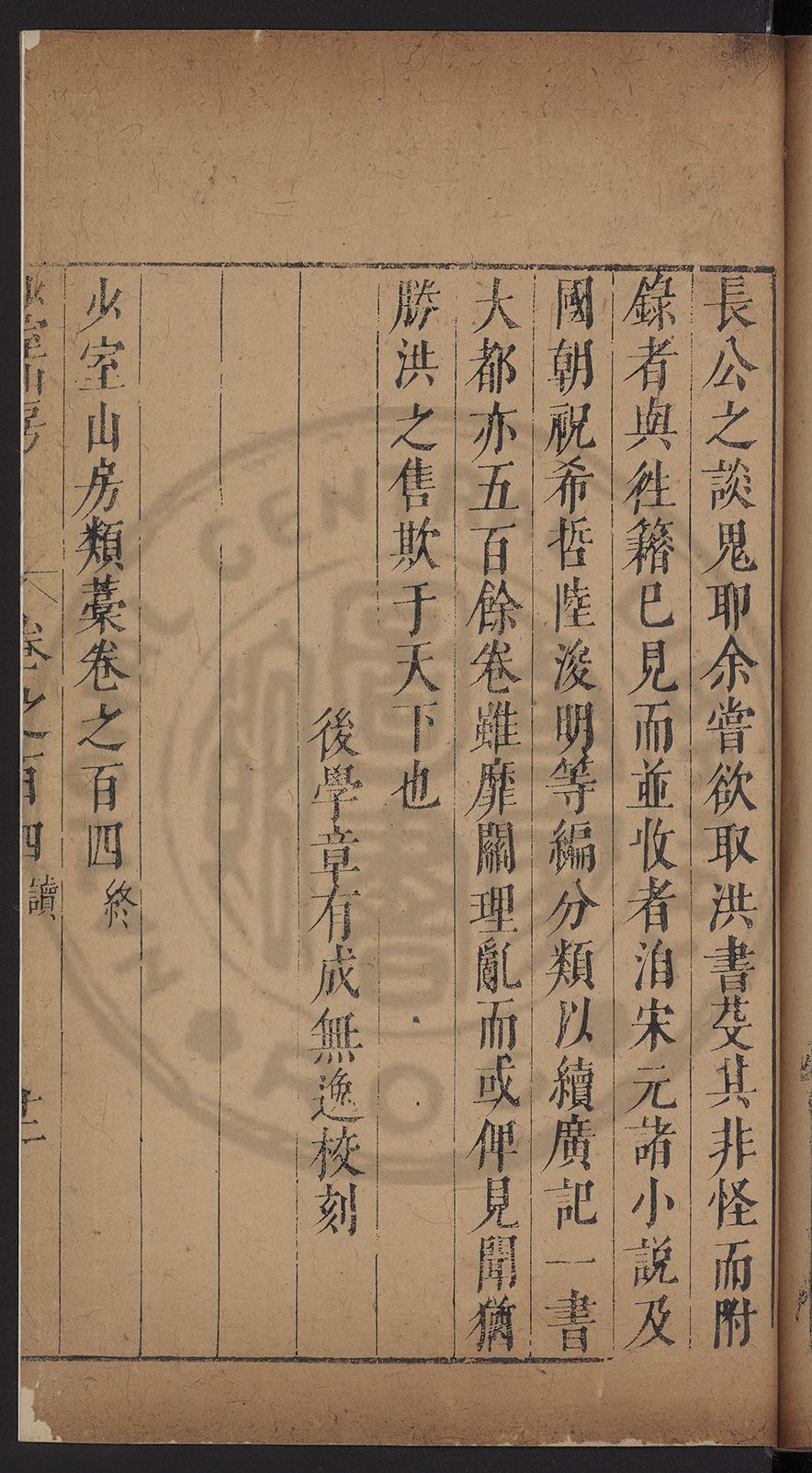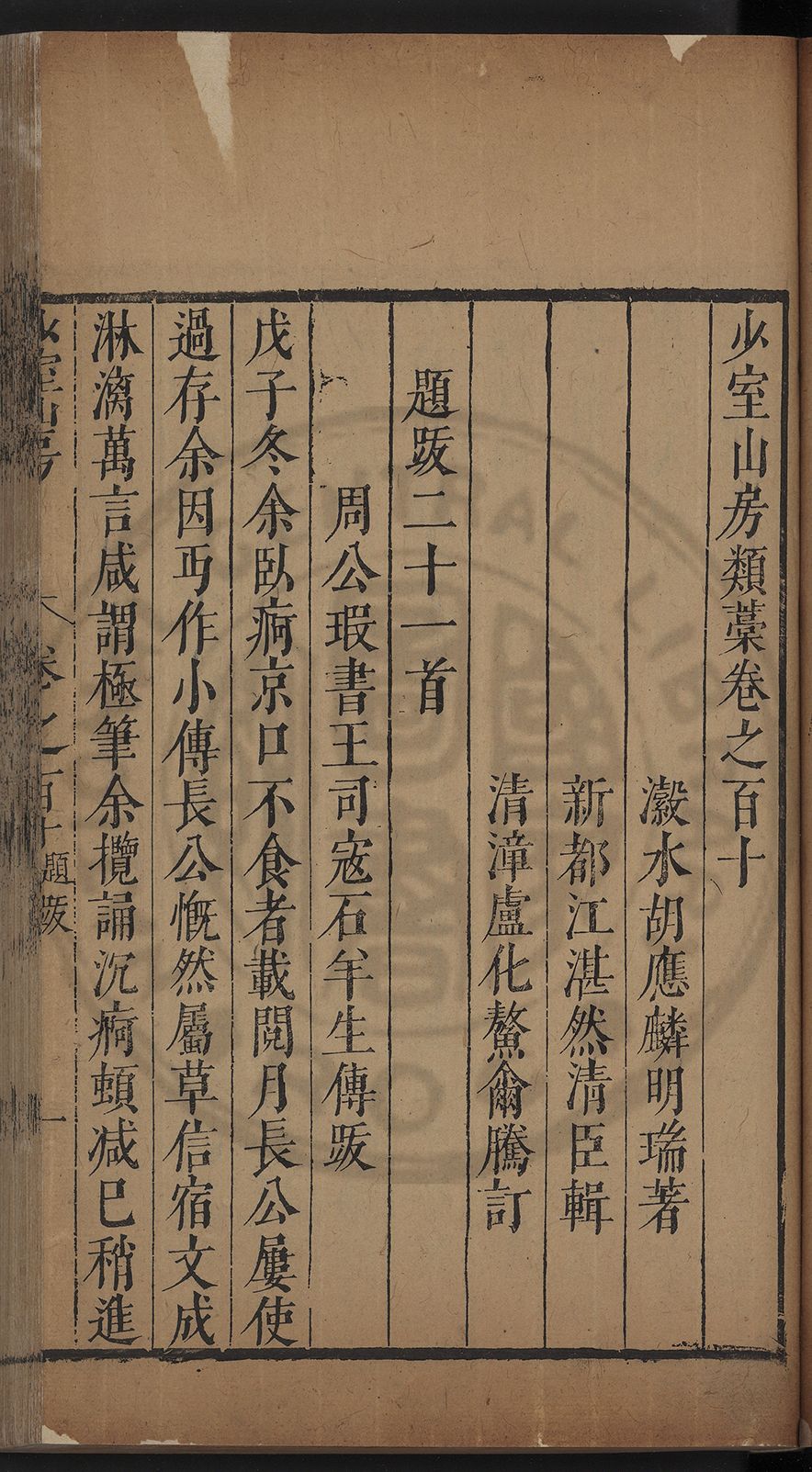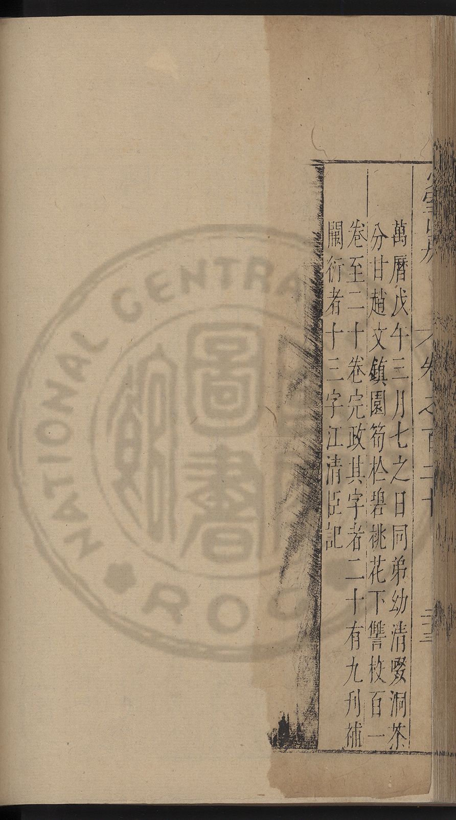 (萬曆戊午三月七之日弟幼清啜洞荼分甘趙文鎮園筍扵碧桃花下讐杖百一卷至二十卷完政其字者二十有九刊補□衍者十三字江清臣記)