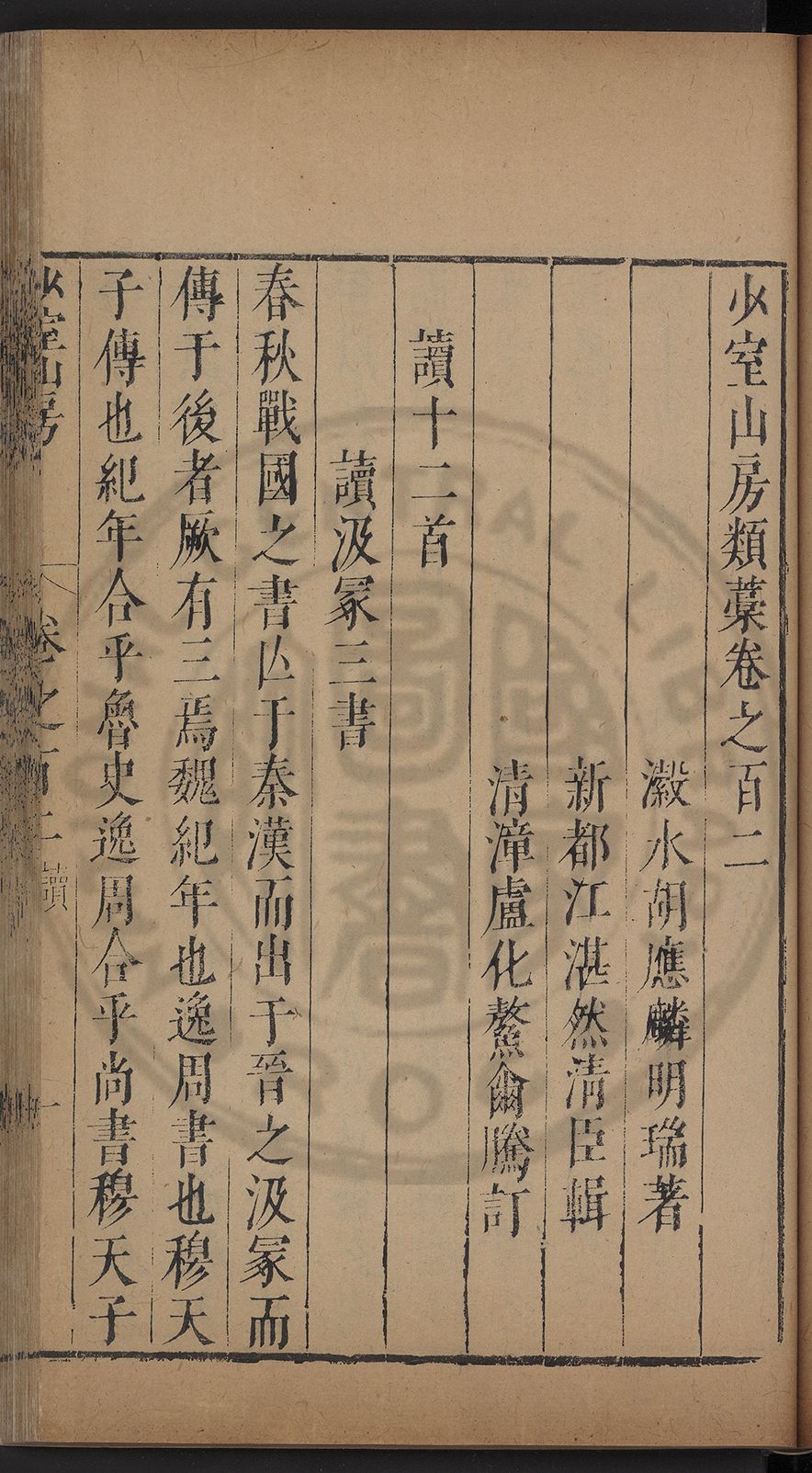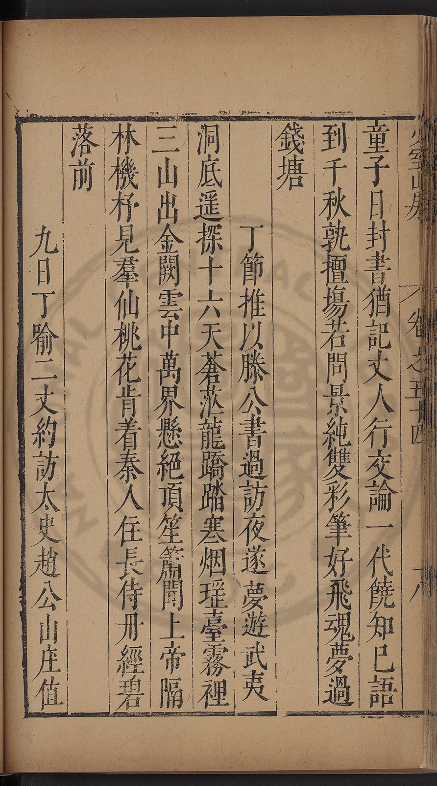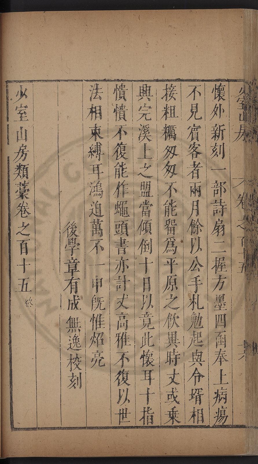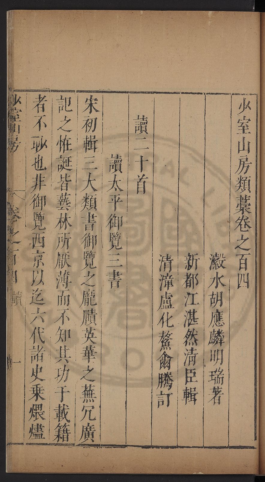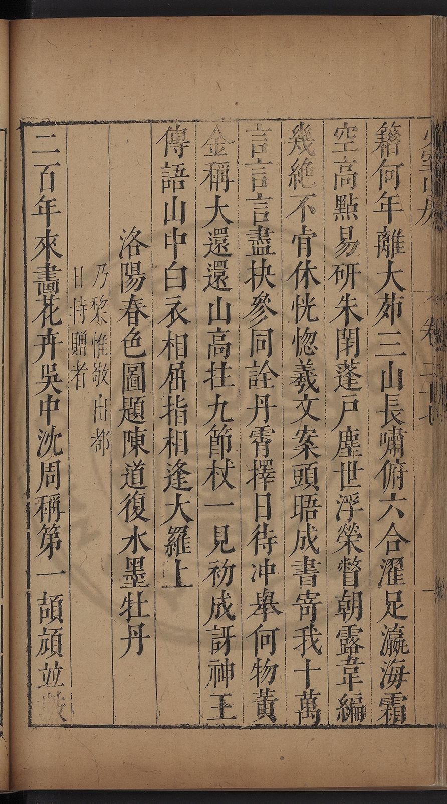 (萬曆戊午三月七之日弟幼清啜洞荼分甘趙文鎮園筍扵碧桃花下讐杖百一卷至二十卷完政其字者二十有九刊補□衍者十三字江清臣記)