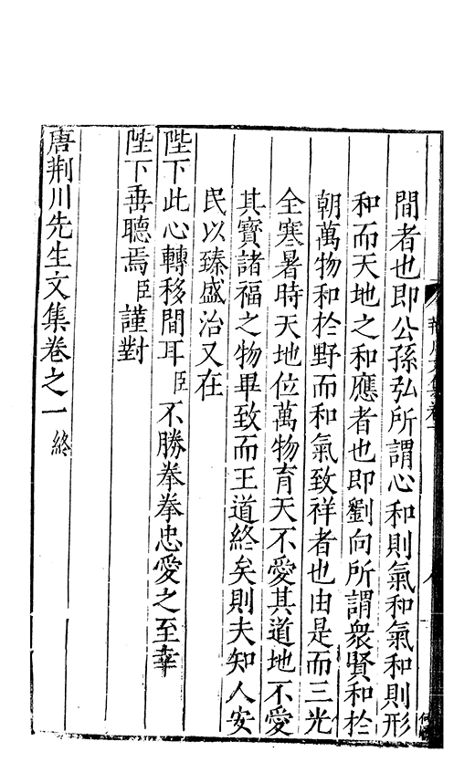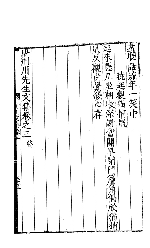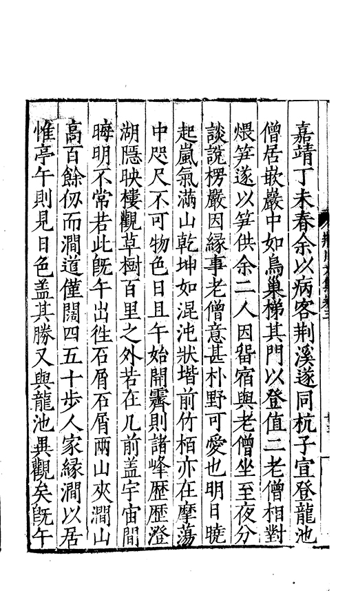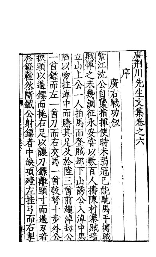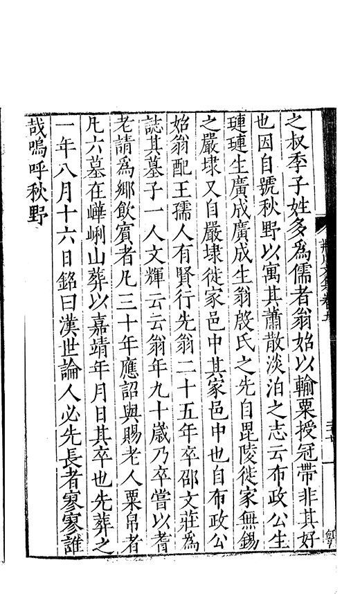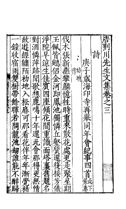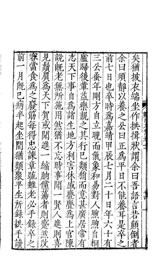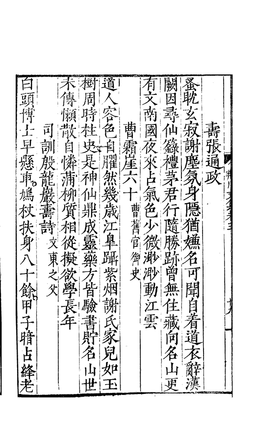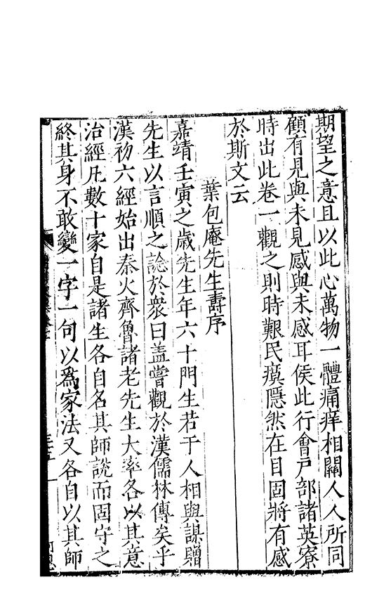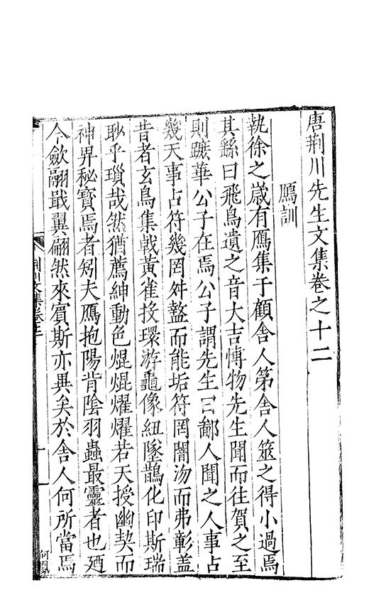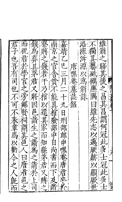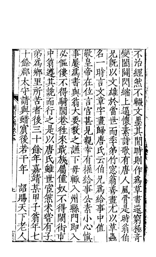 不治經然不輟文墨其間時則作爲草書遂窮極竒變闔闢閃縮上逼懷素詩歌有唐人風骨是時翁伯兄既以文雄於當世而季弟竹窓翁善畫尤以草蟲名一時言文章字畫歸唐氏云伯兄爲給事中值敬皇帝在位言官甚見親幸有權給事公素小心慎事屢爲書與翁大要教之謙下母輙入州縣門即入必傴僂不得騎閭巷徃來戢族屬僮奴不得閙街市中翁遵其說而行之是以唐氏雖世宦然未嘗有子弟爲鄉里所苦者後三十餘年嘉靖某甲子翁年七十餘郡太守請與蜡賔後若干年 詔賜天下老人