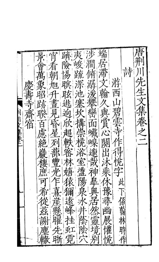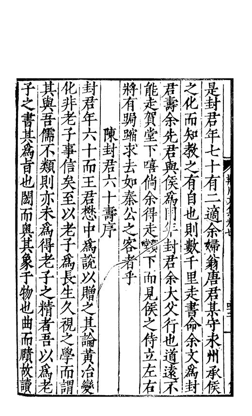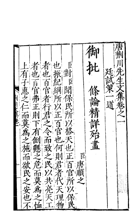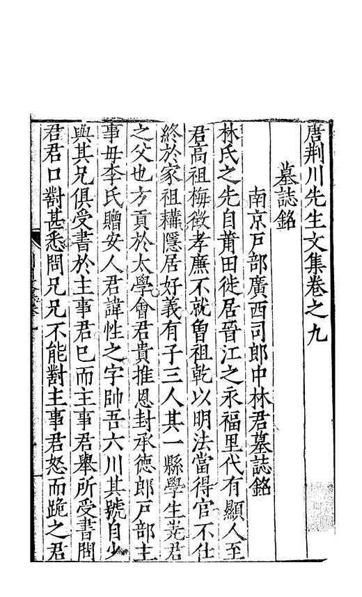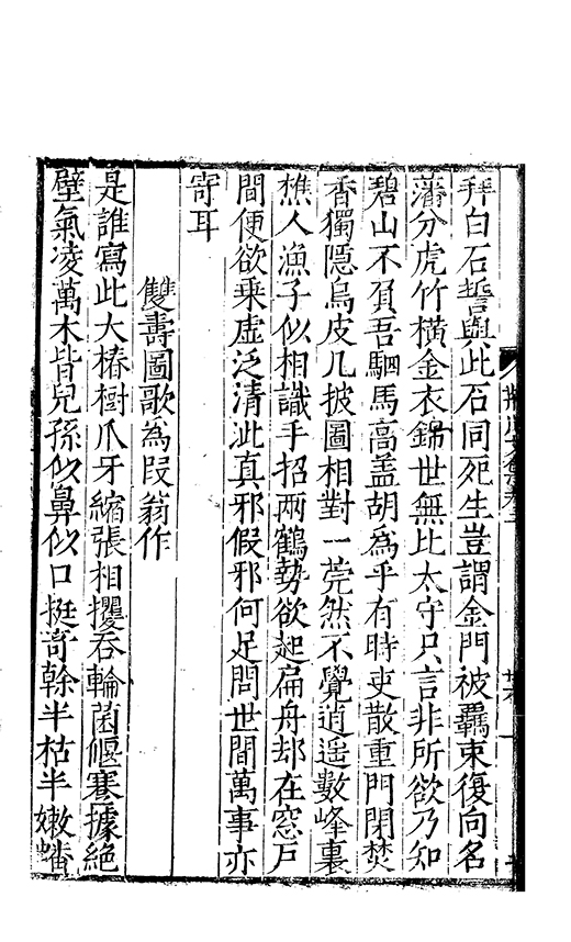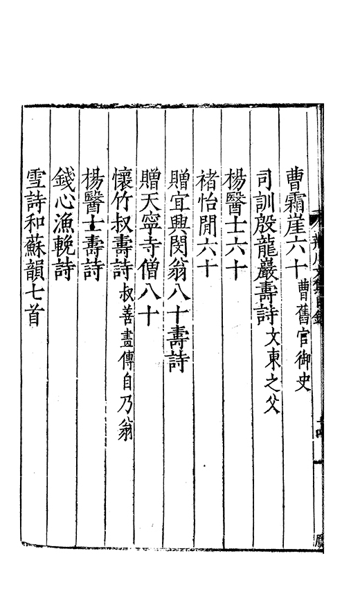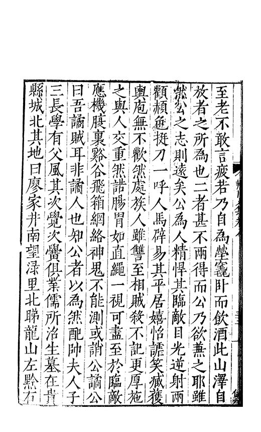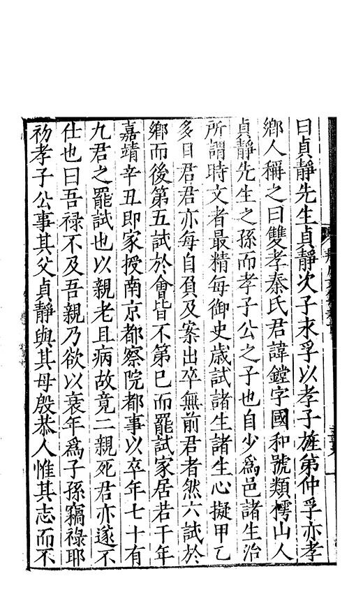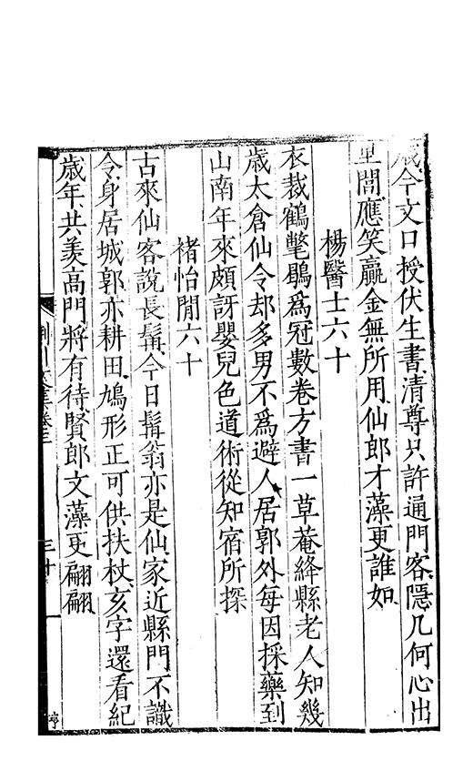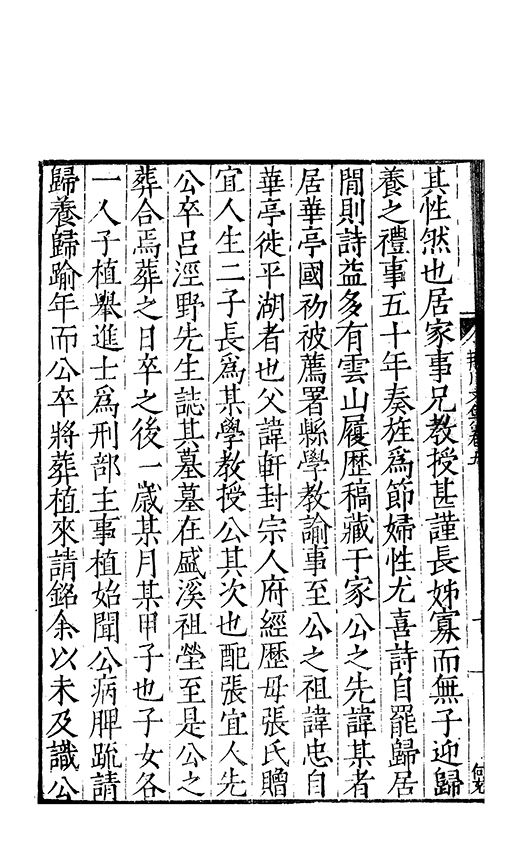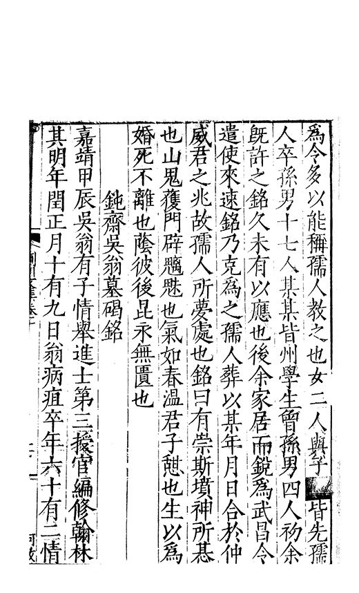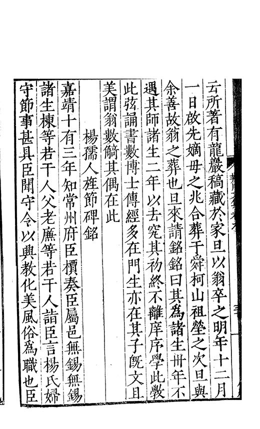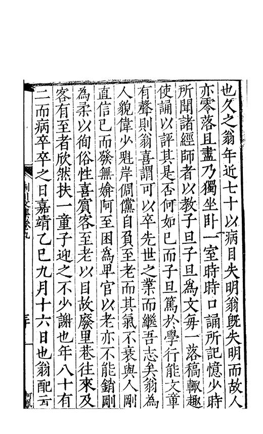 不治經然不輟文墨其間時則作爲草書遂窮極竒變闔闢閃縮上逼懷素詩歌有唐人風骨是時翁伯兄既以文雄於當世而季弟竹窓翁善畫尤以草蟲名一時言文章字畫歸唐氏云伯兄爲給事中值敬皇帝在位言官甚見親幸有權給事公素小心慎事屢爲書與翁大要教之謙下母輙入州縣門即入必傴僂不得騎閭巷徃來戢族屬僮奴不得閙街市中翁遵其說而行之是以唐氏雖世宦然未嘗有子弟爲鄉里所苦者後三十餘年嘉靖某甲子翁年七十餘郡太守請與蜡賔後若干年 詔賜天下老人
