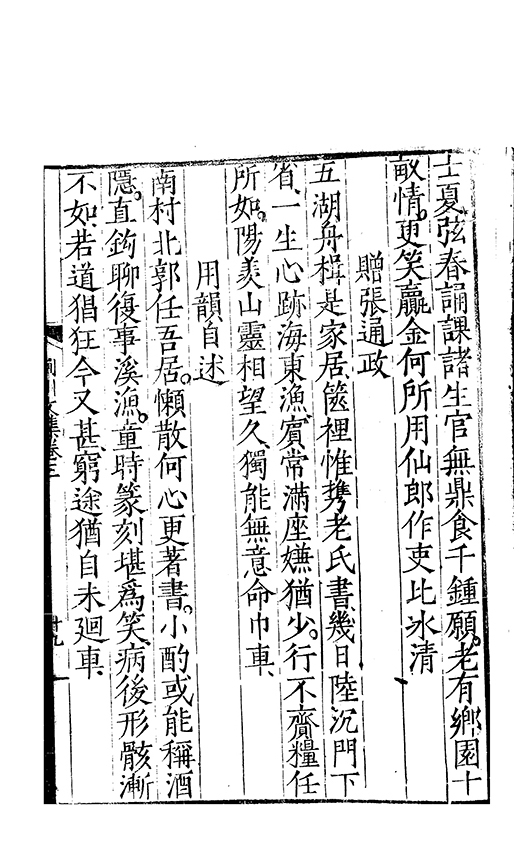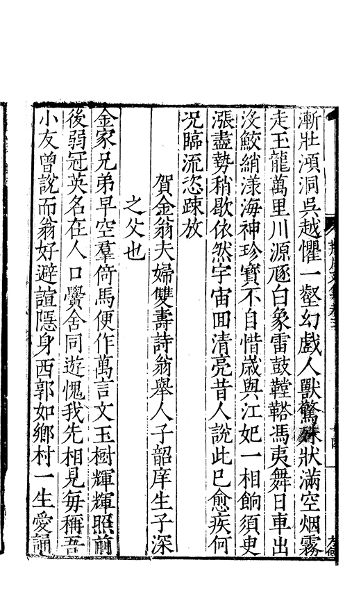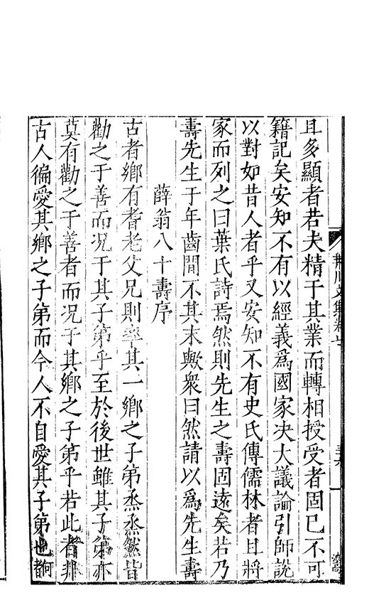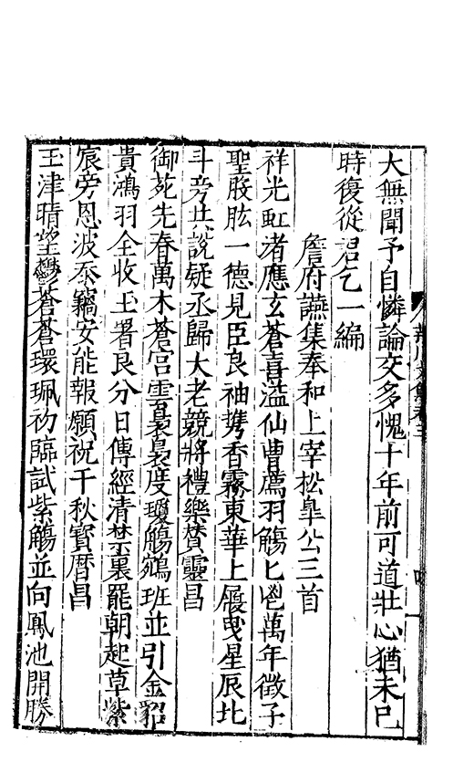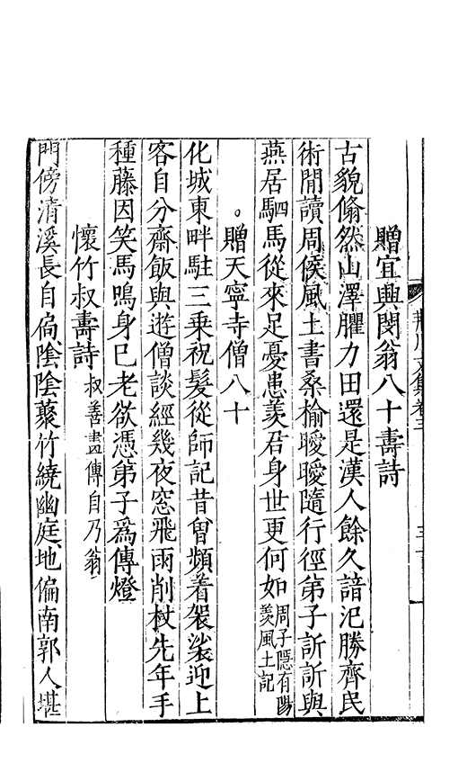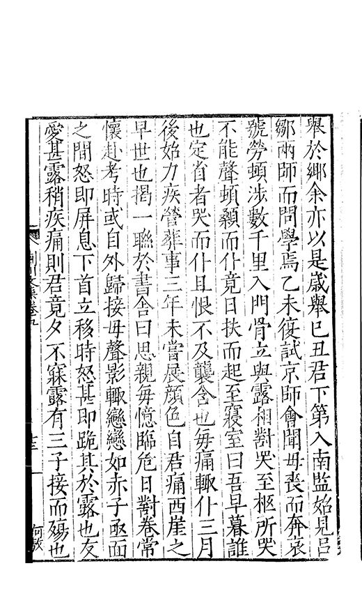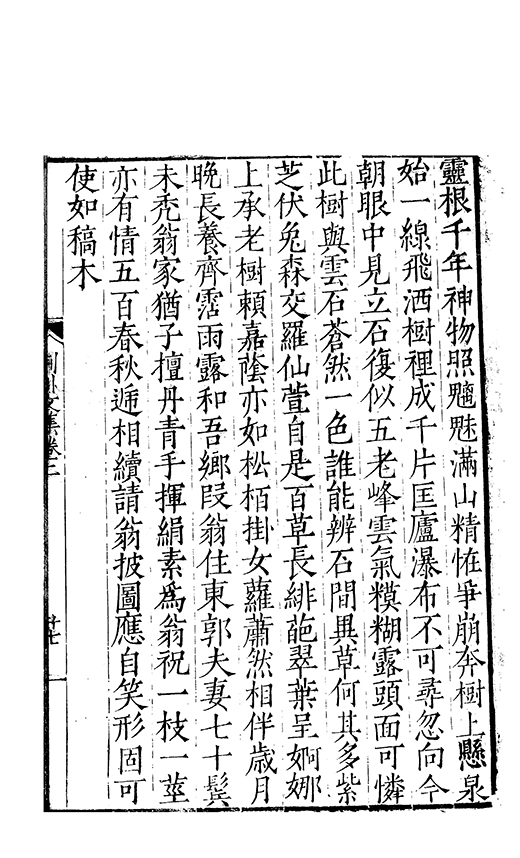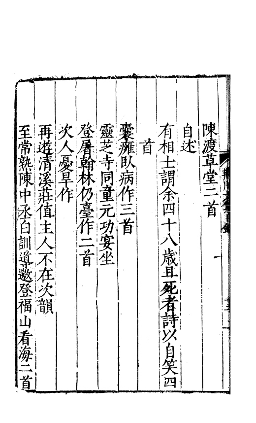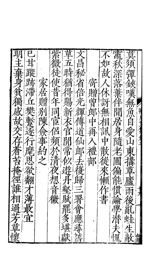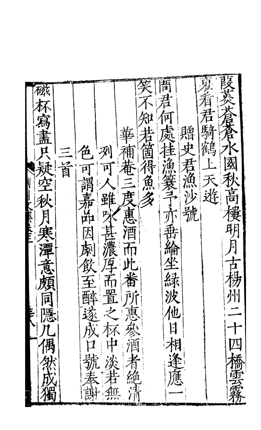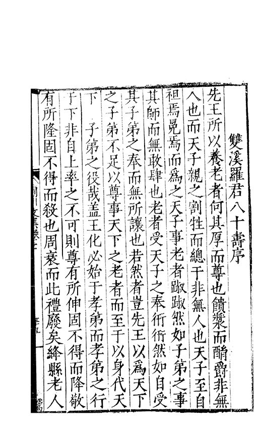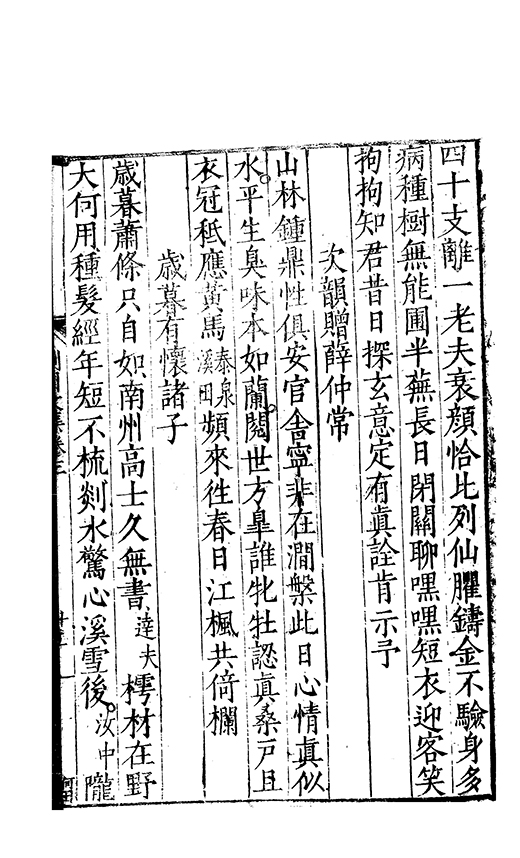不治經然不輟文墨其間時則作爲草書遂窮極竒變闔闢閃縮上逼懷素詩歌有唐人風骨是時翁伯兄既以文雄於當世而季弟竹窓翁善畫尤以草蟲名一時言文章字畫歸唐氏云伯兄爲給事中值敬皇帝在位言官甚見親幸有權給事公素小心慎事屢爲書與翁大要教之謙下母輙入州縣門即入必傴僂不得騎閭巷徃來戢族屬僮奴不得閙街市中翁遵其說而行之是以唐氏雖世宦然未嘗有子弟爲鄉里所苦者後三十餘年嘉靖某甲子翁年七十餘郡太守請與蜡賔後若干年 詔賜天下老人