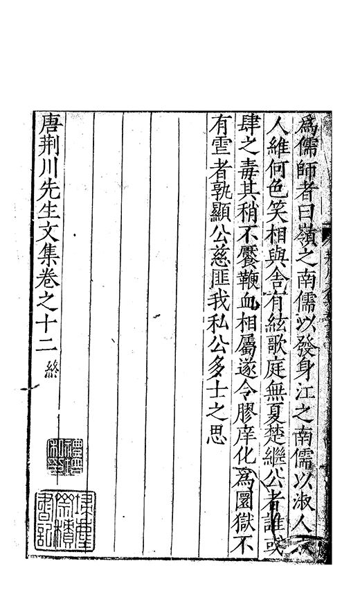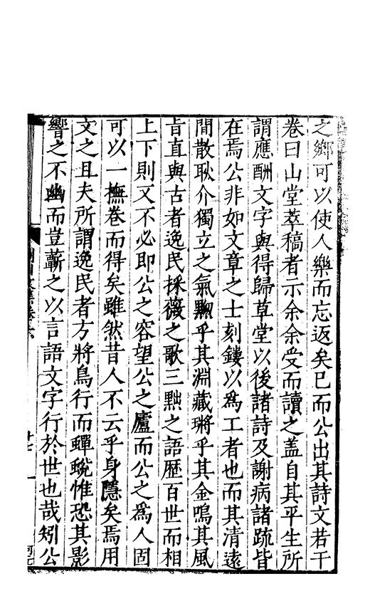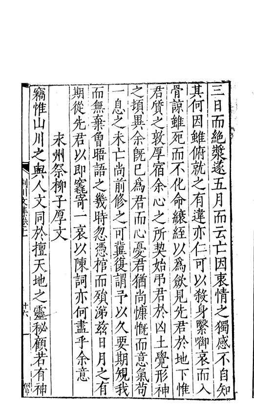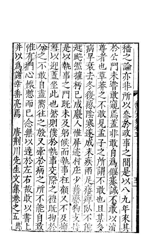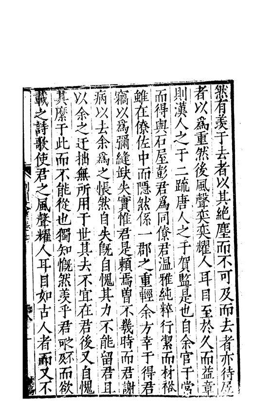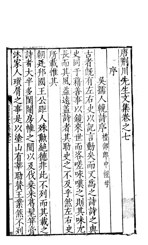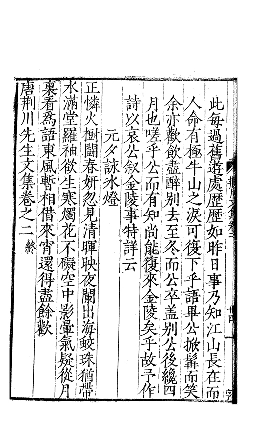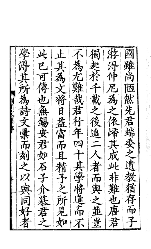 國雖尚陋然先君端委之遗教猶存而子游淂仲尼為之依歸其成此非難也唐君獨起扵千載之後追二人者而與之並豈不為尤難哉君行年四十其學将進而不止其為文将日益冨而且精予之所見如此已可傳也無錫安君如石子介慕君之學淂其所為詩文彚而刻之以與同好者
