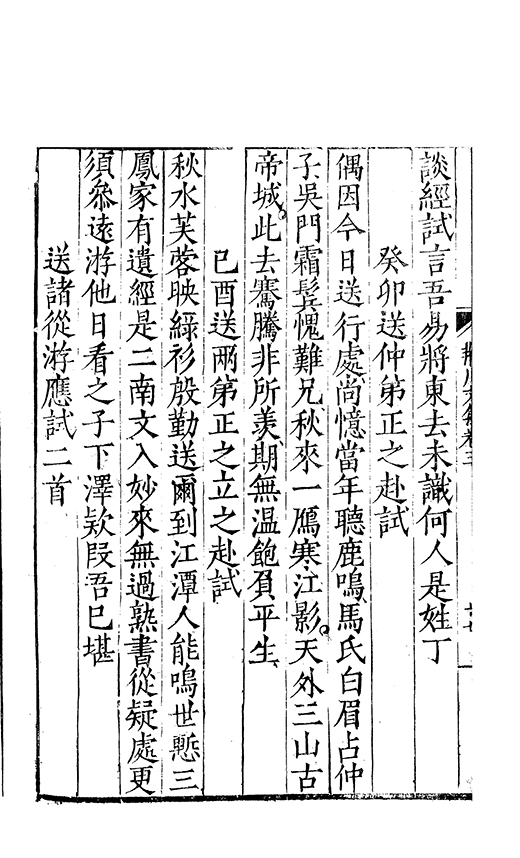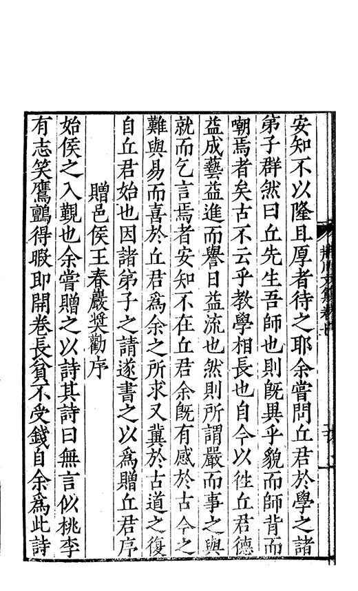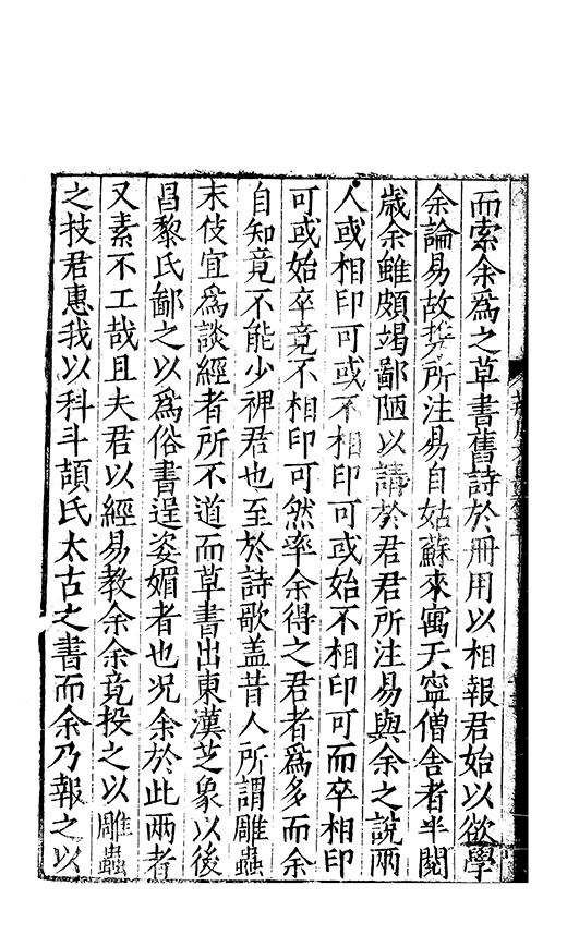 而索余爲之草書舊詩於册用以相報君始以欲學余論易故携所注易自姑蘇來寓天寜僧舎者半閱歳余雖頗竭鄙陋以請於君君所注易與余之說兩人或相印可或不相印可或始不相印可而卒相印可或始卒竟不相印可然率余得之君者爲多而余自知竟不能少禆君也至於詩歌盖昔人所謂雕蟲末伎宜為談經者所不道而草書出東漢芝象以後昌黎氏鄙之以為俗書逞姿媚者也况余於此兩者又素不工哉且夫君以經易教余余竟投之以雕蟲之技君惠我以科斗頡氏大古之書而余乃報之以