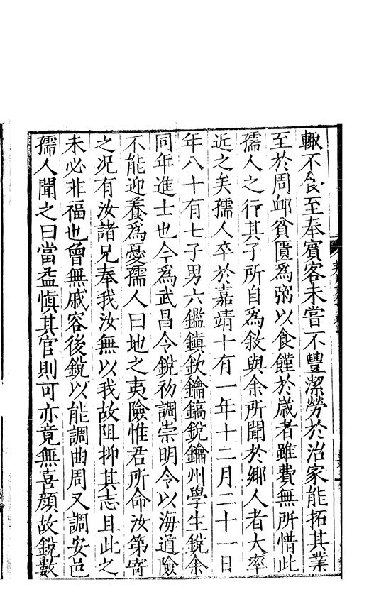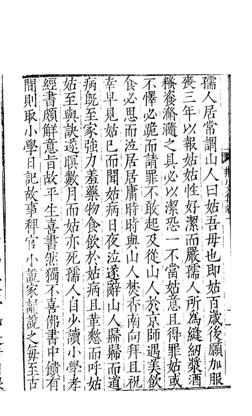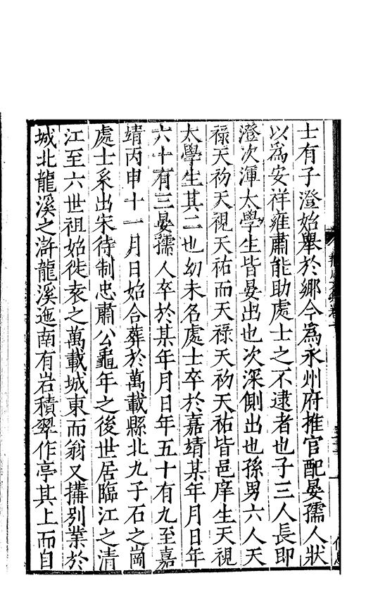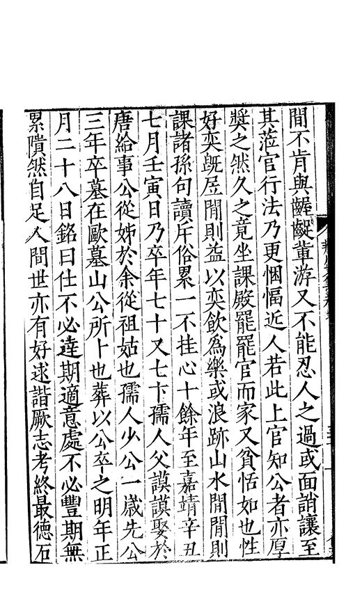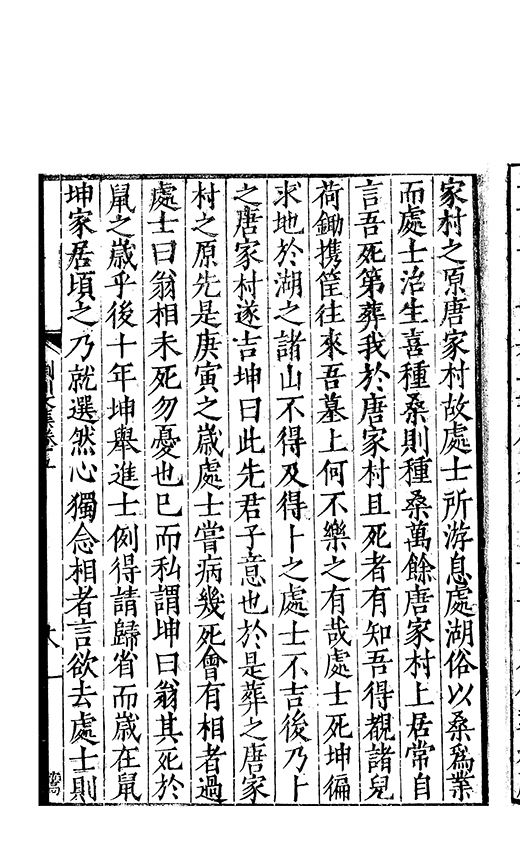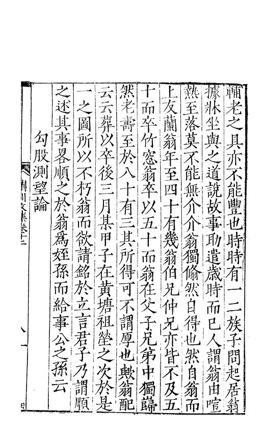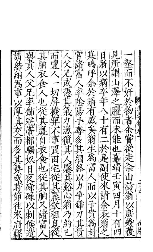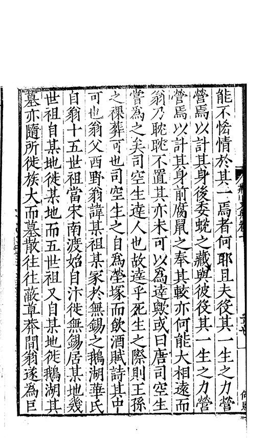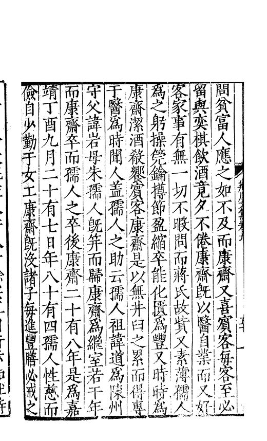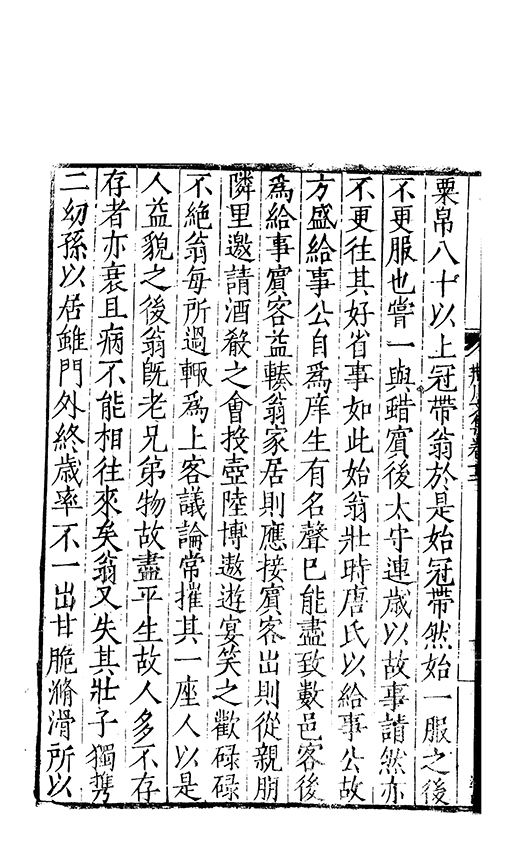 粟帛八十以上冠帶翁於是始冠帶然始一服之後不更服也嘗一與蜡賔後太守連歳以故事請然亦不更往其好省事如此始翁壯時唐氏以給事公故方盛給事公自爲庠生有名聲已能盡致數邑客後爲給事賔客益輳翁家居則應接賔客出則從親朋隣里邀請酒殽之會投壺陸博遨逰宴笑之歡碌碌不絶翁每所過輙爲上客議論常摧其一座人以是人益貌之後翁既老兄弟物故盡平生故人多不存存者亦衰且病不能相往來矣翁又失其壯子獨携二幼孫以居雖門外終歳率不一出甘脆滫滑所以