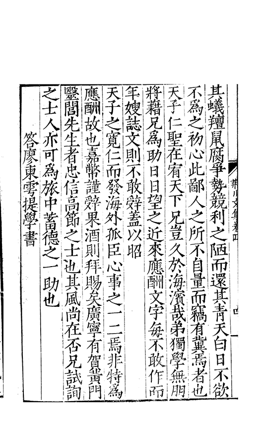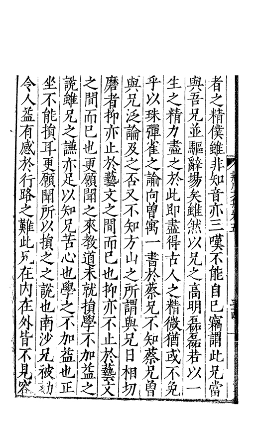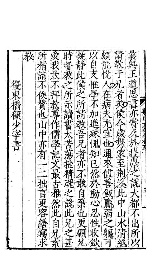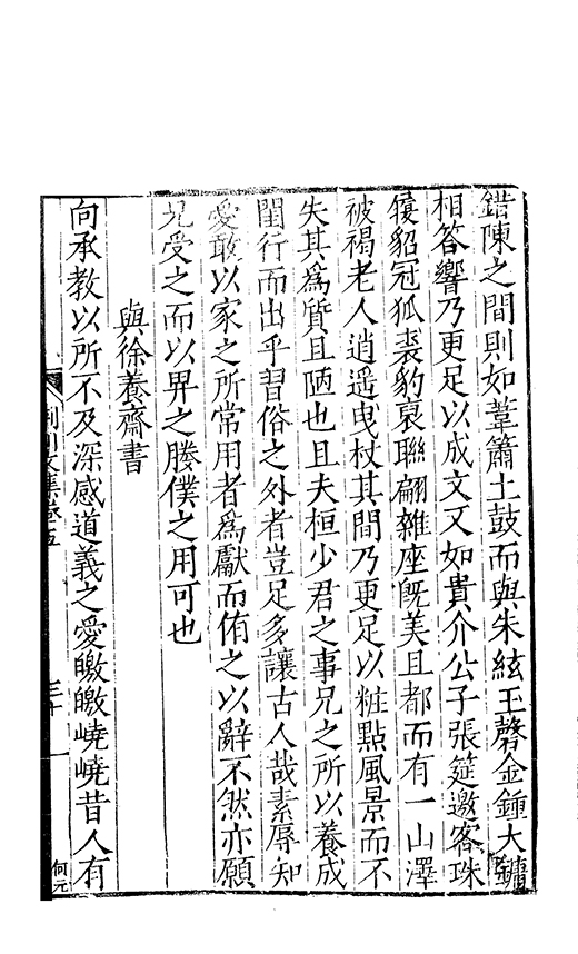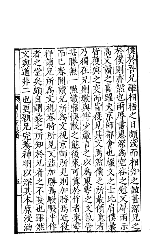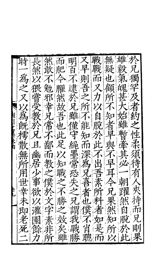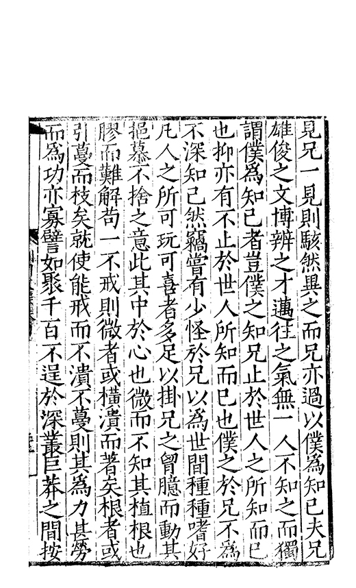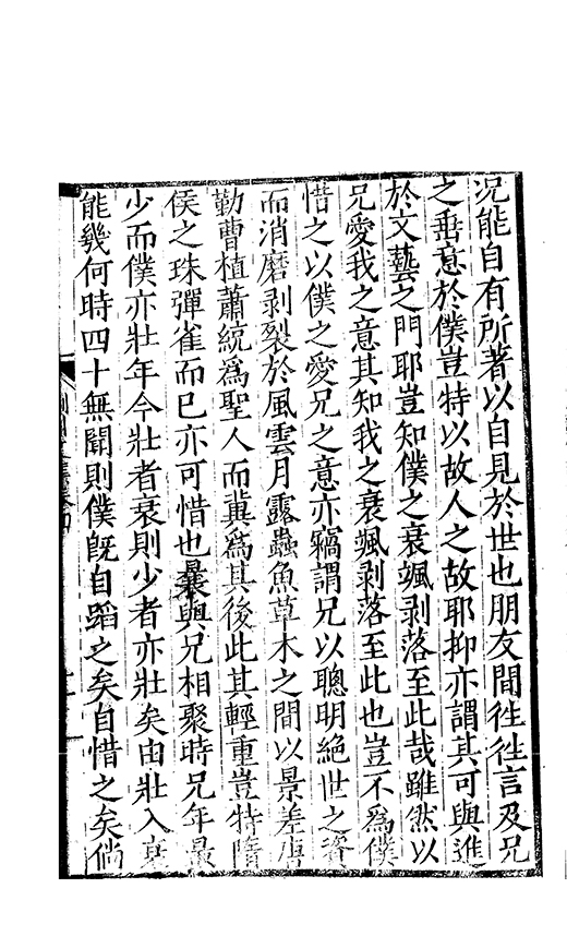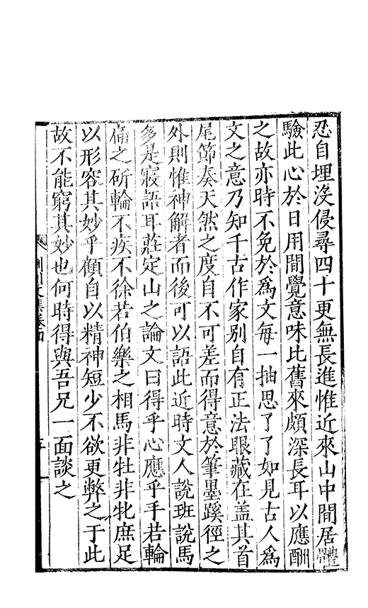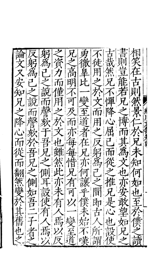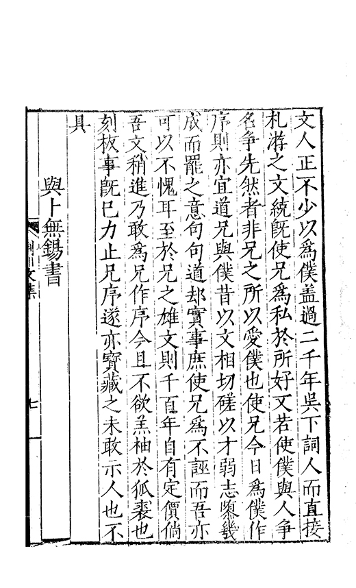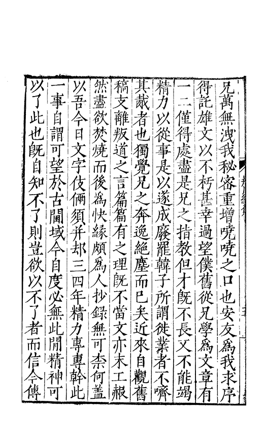 文人正不少以爲僕盖過二千年吳下詞人而直接札游之文統旣使兄爲私於所好又若使僕與人争名争先然者非兄之所以愛僕也使兄今日爲僕作序則亦宜道兄與僕昔以文相切磋以才弱志隳幾成而罷之意句句道却實事庶使兄爲不誣而吾亦可以不愧耳至於兄之雄文則千百年自有定價倘吾文稍進乃敢爲兄作序今且不欲羔袖於狐裘也刻板事旣已力止兄序遂亦寳藏之未敢示人也不具