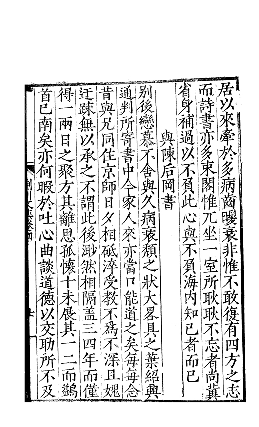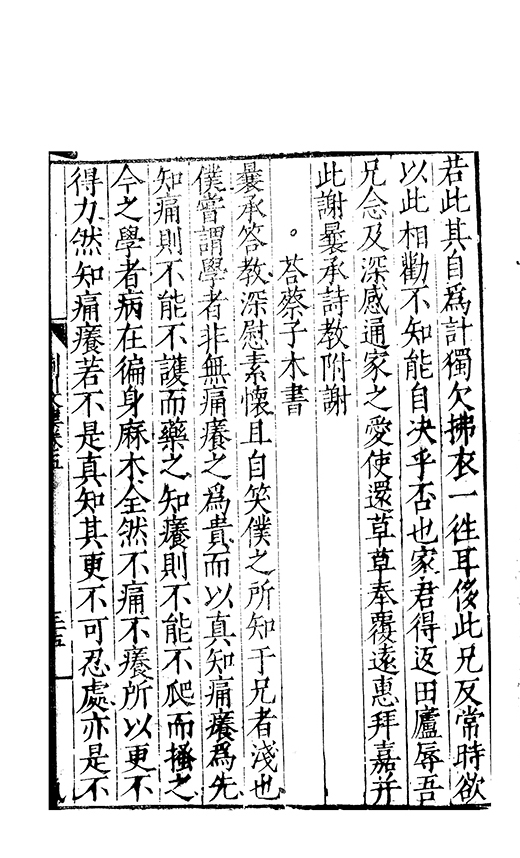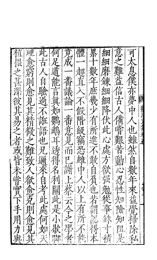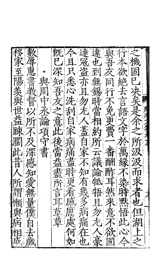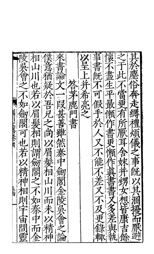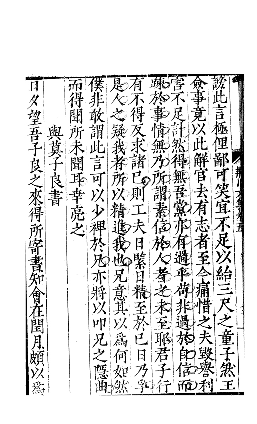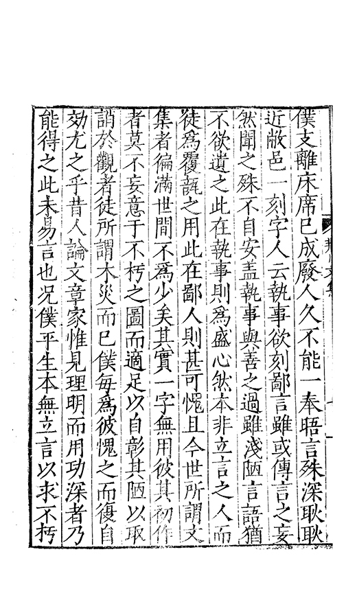 僕支離床席已成廢人久不能一奉晤言殊深耿耿近敝邑一刻字人云執事欲刻鄙言雖或傳言之妄然聞之殊不自安盖執事與善之過雖淺陋言語猶不欲遺之此在執事則爲盛心然本非立言之人而徒爲覆瓿之用此在鄙人則甚可愧且今世所謂文集者徧滿世間不爲少矣其實一字無用彼其初作者莫不妄意于不朽之圖而適足以自彰其陋以取誚於觀者徒所謂木災而已僕毎爲彼愧之而復自効尤之乎昔人論文章家惟見理明而用功深者乃能得之此未易言也况僕平生本無立言以求不朽