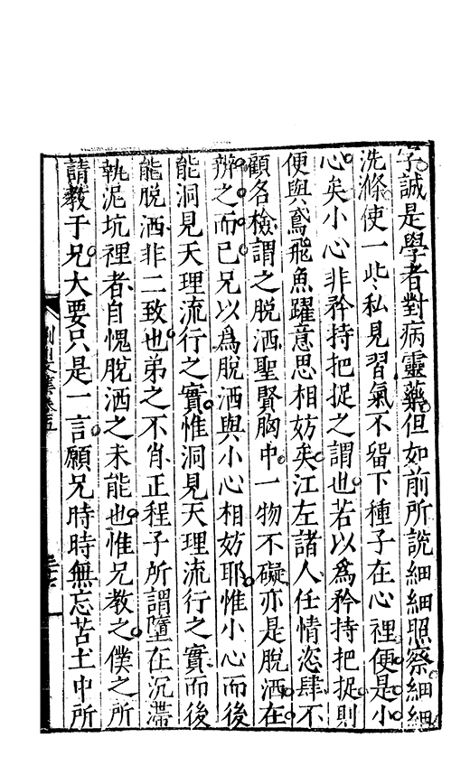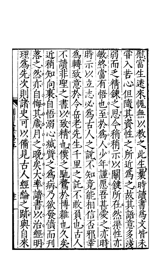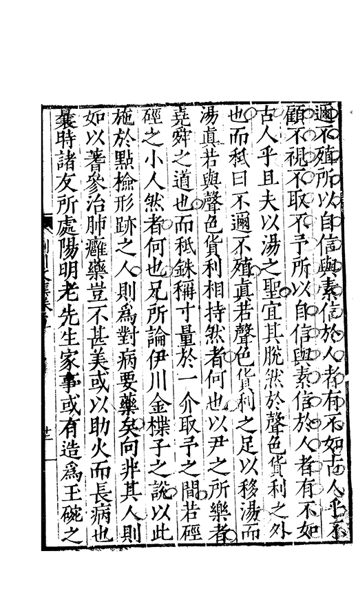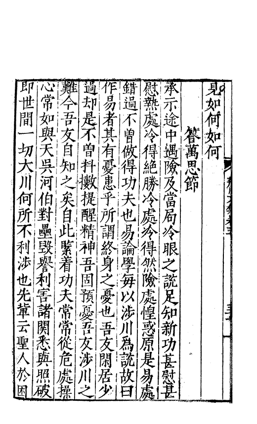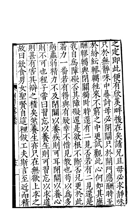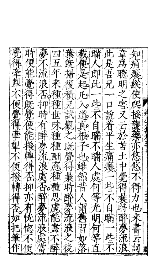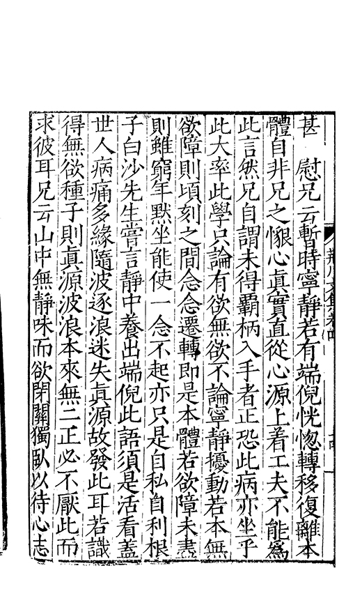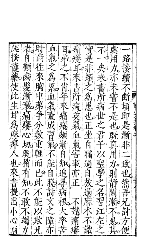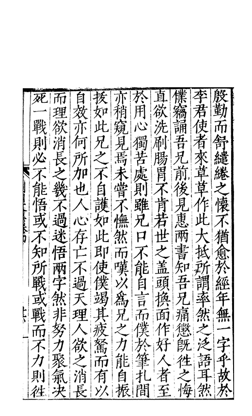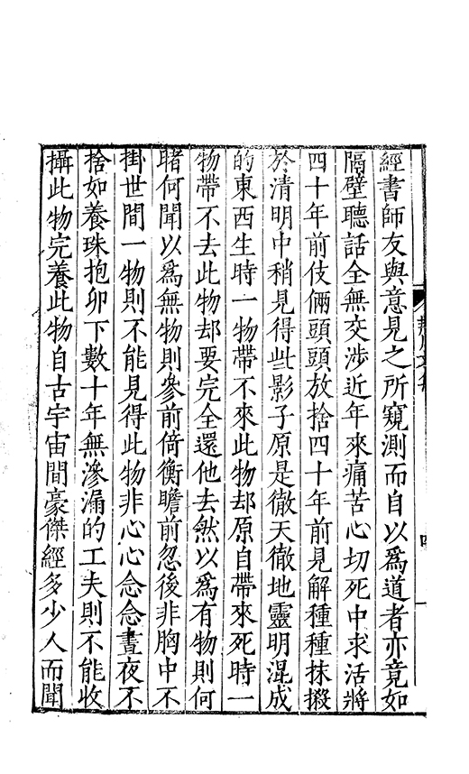 經書師友與意見之所窺測而自以爲道者亦竟如隔壁聴話全無交涉近年來痛苦心切死中求活將四十年前伎倆頭頭放捨四十年前見解種種抹摋於清明中稍見得些影子原是徹天徹地靈明混成的東西生時一物帶不來此物却原自帶來死時一物帶不去此物却要完全還他去然以爲有物則何睹何聞以爲無物則參前倚衡瞻前忽後非胸中不卦世間一物則不能見得此物非心心念念晝夜不捨如養珠抱卯下數十年無滲漏的工夫則不能收攝此物完養此物自古宇宙間豪傑經多少人而聞