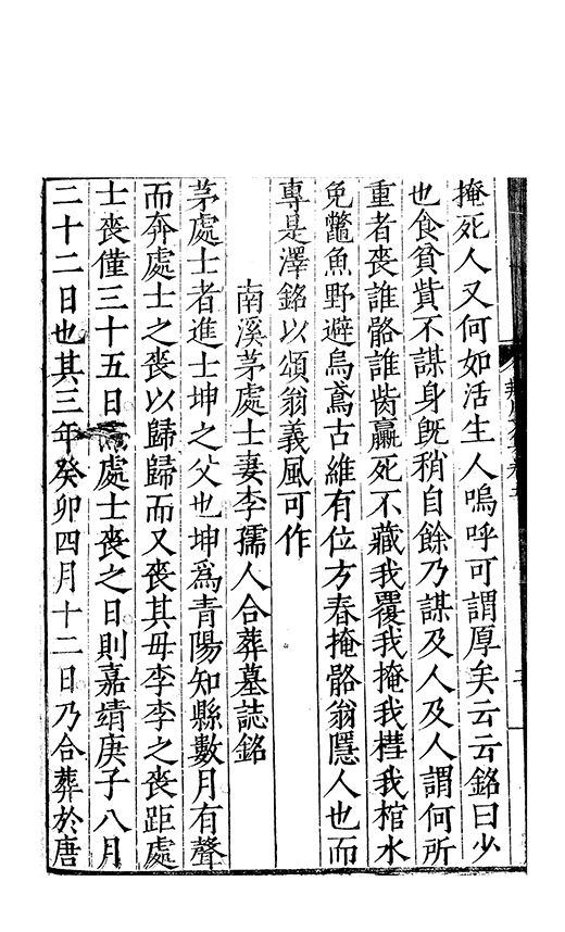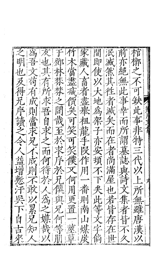 棺槨之不可缺此事非特三代以上所無雖唐漢以前亦絶無此事幸而所謂墓誌與詩文集者皆不久泯滅然其徃者滅矣而在者尚滿屋也若皆存在世間即使以大地爲架子亦安頓不下矣此等文字倘家藏人畜者盡舉祖龍手叚作用一畨則南山煤炭竹木當盡减價矣可笑可笑僕又何用更置一莖草于鄧林棼棼之間哉至於求序於兄僕與兄何等朋友也其有所求吾自求之而何待於人爲之媒哉以爲吾文苟有成則當求兄不成則不敢以累兄知人之明也及得兄序讀之令人益増慙汗吳下自古來
