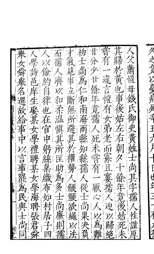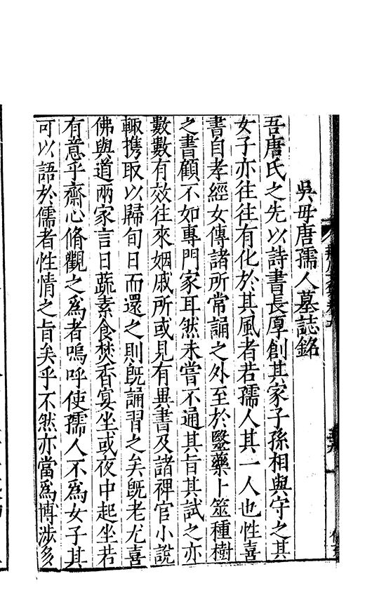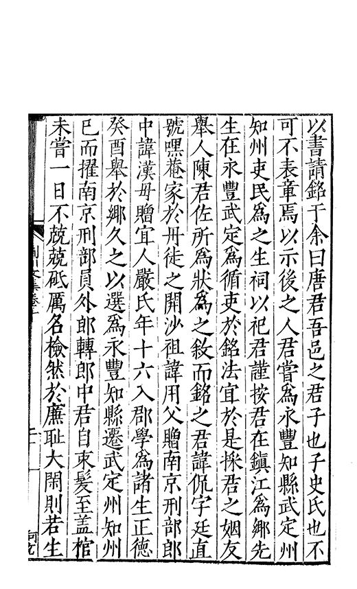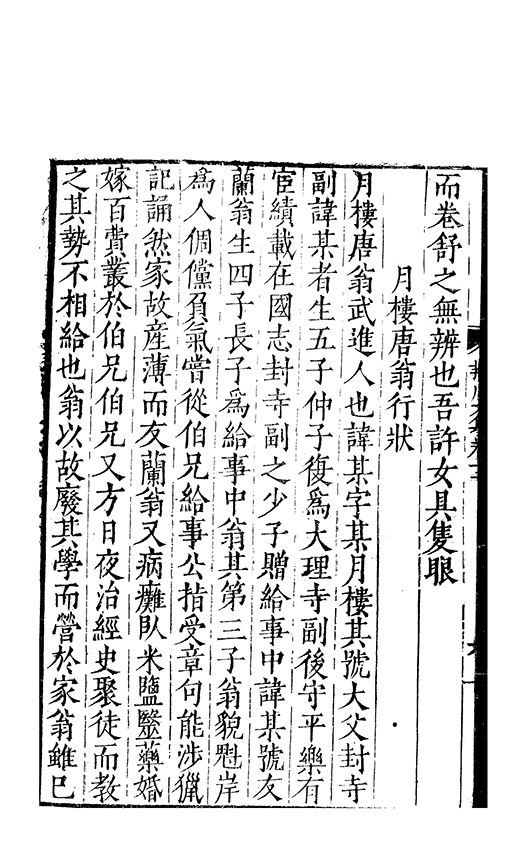 月樓唐翁武進人也諱某字某月樓其號大父封寺副諱某者生五子仲子復爲大理寺副後守平樂有宦績載在國志封寺副之少子贈給事中諱某號友蘭翁生四子長子爲給事中翁其第三子翁貌魁岸爲人倜儻負氣嘗從伯兄給事公指受章句能渉獵記誦然家故産薄而友蘭翁又病癱臥米鹽毉藥婚嫁百費叢於伯兄伯兄又方日夜治經史聚徒而教之其勢不相給也翁以故廢其學而營於家翁雖已