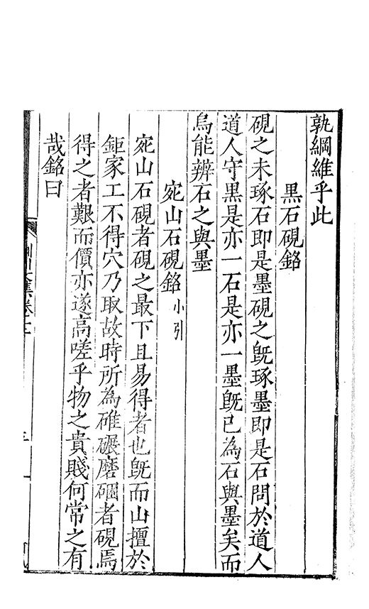 宛山石硯者硯之最下且易得者也既而山擅於鉅家工不得穴乃取故時所為碓碾磨硱者硯焉得之者艱而價亦遂高嗟乎物之貴賤何常之有哉銘曰