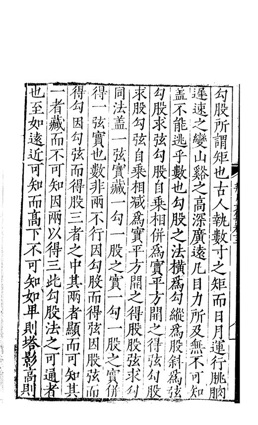 勾股所謂矩也古人執數寸之矩而日月運行朓朒遲速之變山谿之高深廣逺凡目力所及無不可知盖不能逃乎數也勾股之法横為勾縱為股斜為弦勾股求弦勾股自乘相併為實平方開之得弦勾股求股勾弦自乘相减為實平方開之得股股弦求勾同法盖一弦實藏一勾一股之實一勾一股之實併得一弦實也數非兩不行因勾股而得弦因股弦而得勾因勾弦而得股三者之中其兩者顯而可知其一者藏而不可知因兩以得三此勾股法之可通者也至如逺近可知而髙下不可知如卑則塔影高則
