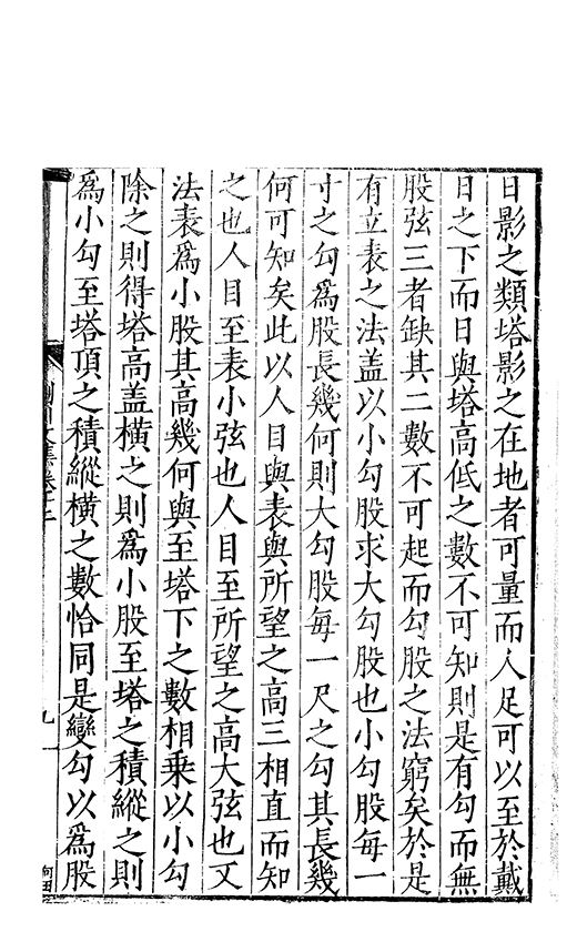 日影之類塔影之在地者可量而人足可以至於戴日之下而日與塔高低之數不可知則是有勾而無股弦三者缺其二數不可起而勾股之法窮矣於是有立表之法盖以小勾股求大勾股也小勾股每一寸之勾為股長幾何則大勾股每一尺之勾其長幾何可知矣此以人目與表與所望之高三相直而知之也人目至表小弦也人目至所望之高大弦也又法表爲小股其高幾何與至塔下之數相乗以小勾除之則得塔高盖横之則爲小股至塔之積縱之則爲小勾至塔頂之積縱横之數恰同是變勾以爲股