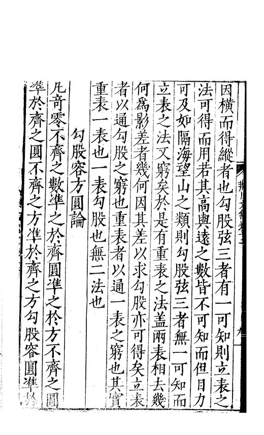 因横而得縱者也勾股弦三者有一可知則立表之法可得而用若其高與逺之數皆不可知而但目力可及如隔海望山之類則勾股弦三者無一可知而立表之法又窮矣於是有重表之法盖兩表相去幾何爲影差者幾何因其差以求勾股亦可得矣立表者以通勾股之窮也重表者以通一表之窮也其實重表一表也一表勾股也無二法也