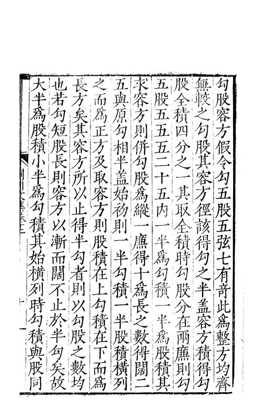 勾股容方假令勾五股五弦七有竒此為整方均齊無較之勾股其容方徑該得勾之半盖容方積得勾股全積四分之一其取全積時勾股分在兩廉則勾五股五五五二十五内一半為勾積一半為股積其求容方則併勾股為縱一廉得十為長之數得闊二五與原勾相半盖始初則一半勾積一半股積横列之而為正方及取容方則股積在上勾積在下而為長方矣其容方所以止得半勾者則以勾股之數均也若勾短股長則容方以漸而闊不止於半勾矣故大半為股積小半為勾積其始横列時勾積與股同