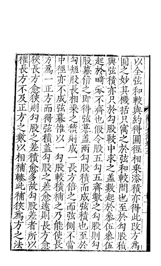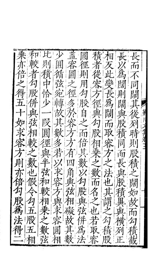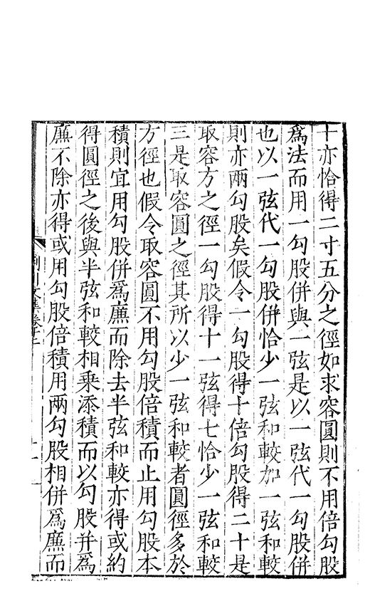 十亦恰得二寸五分之徑如求容圓則不用倍勾股為法而用一勾股併與一弦是以一弦代一勾股併也以一弦代一勾股併恰少一弦和較加一弦和較則亦兩勾股矣假令一勾股得十倍勾股得二十是取容方之徑一勾股得十一弦得七恰少一弦和較三是取容圓之徑其所以少一弦和較者圓徑多於方徑也假令取容圓不用勾股倍積而止用勾股本積則宜用勾股併為廉而除去半弦和較亦得或約得圓徑之後與半弦和較相乗添積而以勾股并為廉不除亦得或用勾股倍積用兩勾股相併為廉而