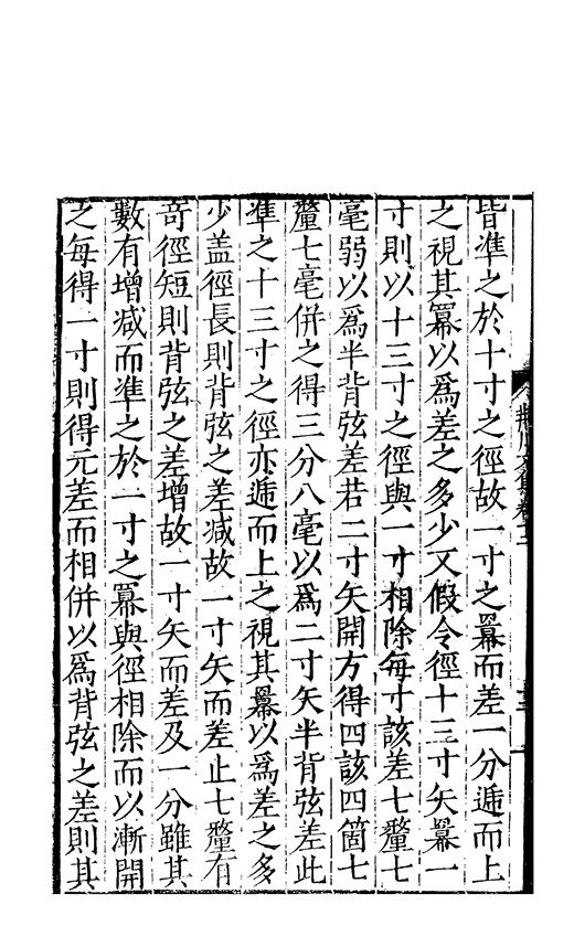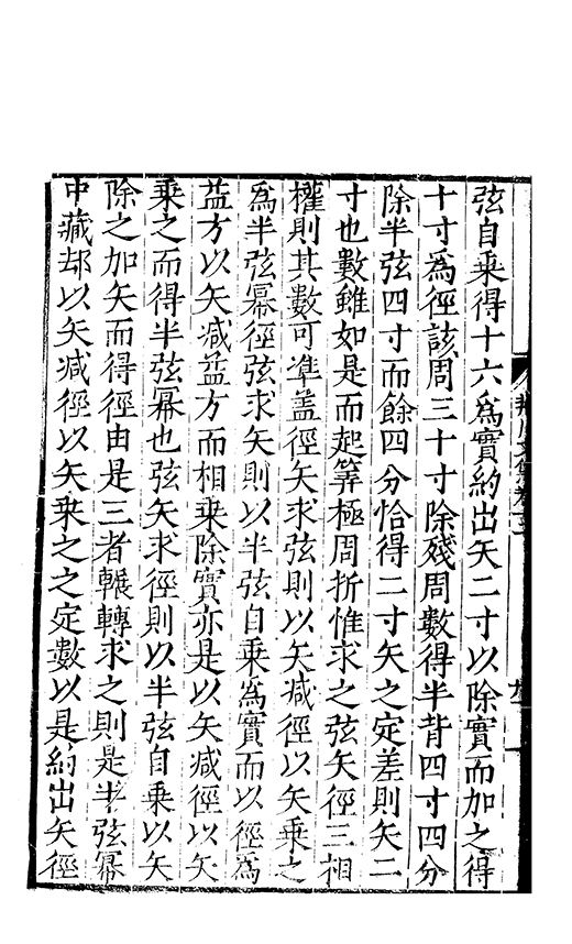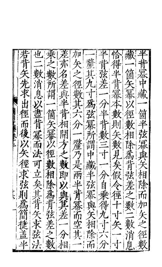 弦自乗得十六爲實約出矢二寸以除實而加之得十寸爲徑該周三十寸除殘周數得半背四寸四分除半弦四寸而餘四分恰得二寸矢之定差則矢二寸也數雖如是而起算極周折惟求之弦矢徑三相權則其數可凖盖徑矢求弦則以矢减徑以矢乗之爲半弦冪徑弦求矢則以半弦自乗爲實而以徑爲益方以矢减益方而相乗除實亦是以矢减徑以矢乗之而得半弦冪也弦矢求徑則以半弦自乗以矢除之加矢而得徑由是三者輾轉求之則是半弦冪中藏却以矢减徑以矢乗之之定數以是約出矢徑