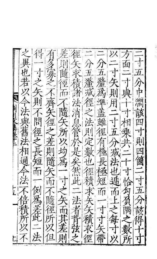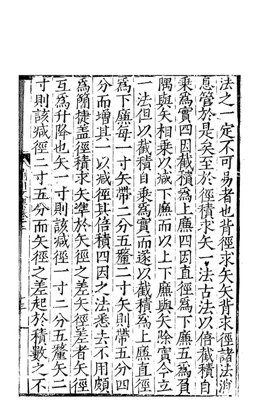 法之一定不可易者也背徑求矢矢背求徑諸法消息管於是矣至於徑積求矢一法古法以倍截積自乗為實四因截積為上廉四因直徑為下廉五為負隅與矢相乗以减下廉而以上下廉與矢除實今立一法但以截積自乗為實而遂以截積為上廉直徑為下廉每一寸矢帶二分五釐二寸矢則帶五分四分而增其一以减徑其倍積四因之法悉去不用頗為簡捷盖徑積求矢凖於矢徑之差矢徑差者矢徑互為升降也矢一寸則該减徑一寸二分五釐矢二寸則該减徑二寸五分而矢徑之差起於積數之不
