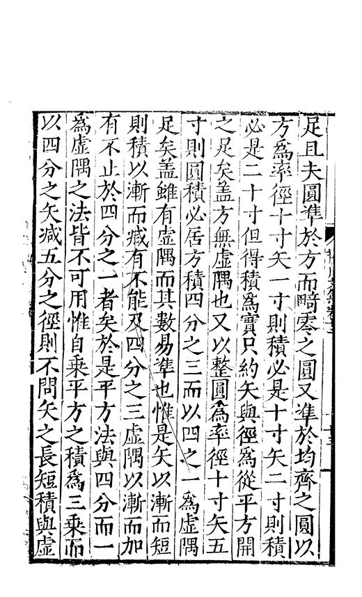 足且夫圓凖於方而畸零之圓又凖於均齊之圓以方為率徑十寸矢一寸則積必是十寸矢二寸則積必是二十寸但得積為實只約矢與徑為從平方開之足矣盖方無虚隅也又以整圓為率徑十寸矢五寸則圓積必居方積四分之三而以四之一為虚隅足矣盖雖有虚隅而其數易凖也惟是矢以漸而短則積以漸而减有不能及四分之三虚隅以漸而加有不止於四分之一者矣於是平方法與四分而一爲虚隅之法皆不可用惟自乗平方之積爲三乗而以四分之矢减五分之徑則不問矢之長短積與虚