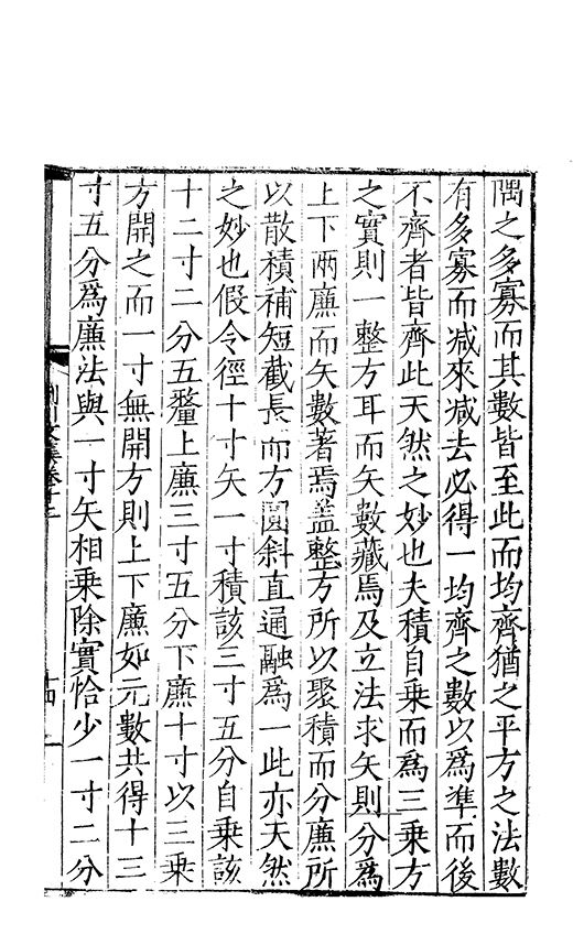 隅之多寡而其數皆至此而均齊猶之平方之法數有多寡而减來减去必得一均齊之數以爲凖而後不齊者皆齊此天然之妙也夫積自乗而爲三乗方之實則一整方耳而矢數藏焉及立法求矢則分爲上下兩廉而矢數著焉盖整方所以聚積而分廉所以散積補短截長而方圓斜直通融爲一此亦天然之妙也假令徑十寸矢一寸積該三寸五分自乗該十二寸二分五釐上廉三寸五分下廉十寸以三乗方開之而一寸無開方則上下廉如元數共得十三寸五分為廉法與一寸矢相乗除實恰少一寸二分