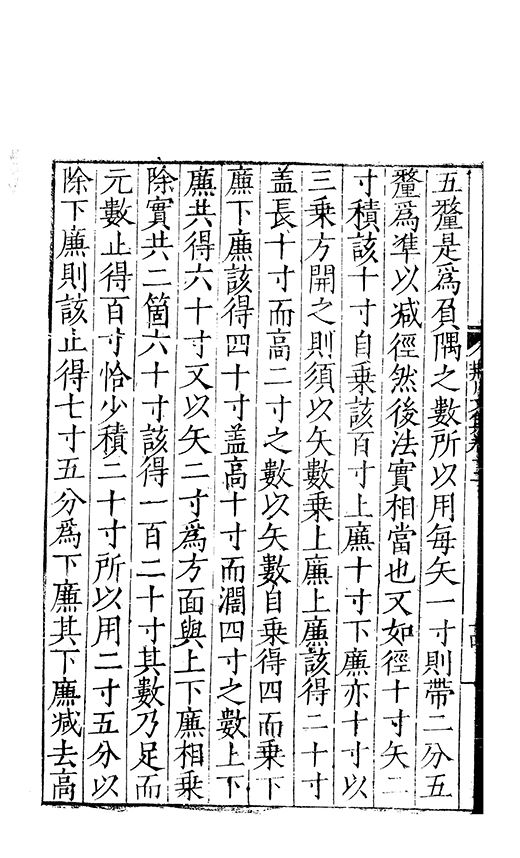 五釐是為負隅之數所以用每矢一寸則帶二分五釐為凖以减徑然後法實相當也又如徑十寸矢二寸積該十寸自乗該百寸上廉十寸下廉亦十寸以三乗方開之則須以矢數乗上廉上廉該得二十寸盖長十寸而高二寸之數以矢數自乗得四而乗下廉下廉該得四十寸盖高十寸而闊四寸之數上下廉共得六十寸又以矢二寸為方面與上下廉相乗除實共二箇六十寸該得一百二十寸其數乃足而元數止得百寸恰少積二十寸所以用二寸五分以除下廉則該止得七寸五分為下廉其下廉减去高