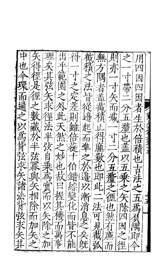 用四因四因者生於倍積也古法之五為負隅即今之一寸帶二分五釐也盖以五乗之矢除四因之徑則亦一寸矢而减一寸二分五釐之徑也然有廉而無方隅者盖截積止得廉數也即此二法可見截弧截積之法皆從邊起而凖之於邊以漸消息之矣既得一寸之定差則雖倍蓰十伯錯綜變化而皆不能出乎範圍之外此天然之妙也故曰握其機而萬事理矣其弦矢求徑法半弦自乗為實而以矢除之加矢得徑是徑之數藏於半弦冪與矢相除而加矢之中也今環而通之以為背弦求矢諸法背弦求矢其