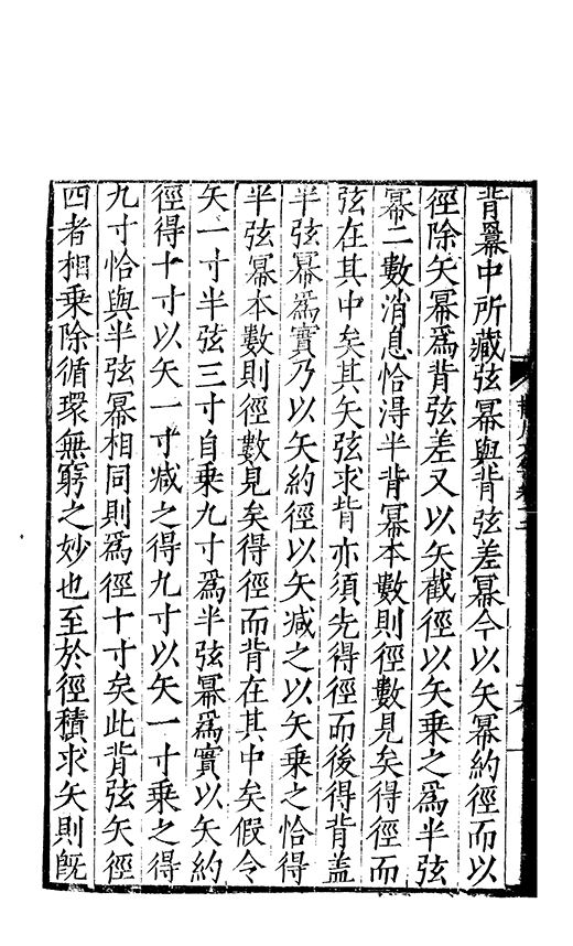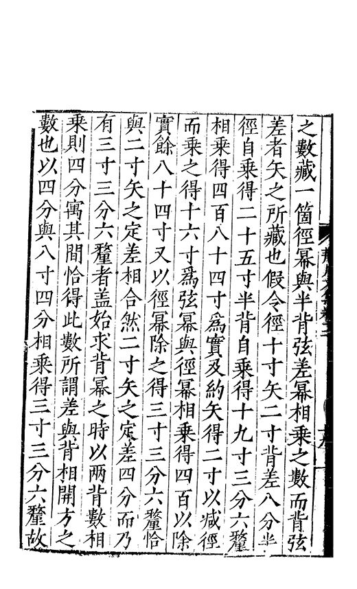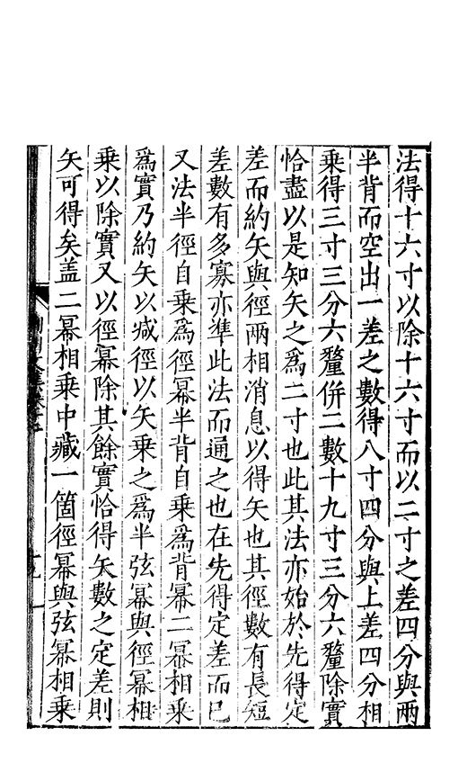 法得十六寸以除十六寸而以二寸之差四分與兩半背而空出一差之數得八寸四分與上差四分相乗得三寸三分六釐併二數十九寸三分六釐除實恰盡以是知矢之為二寸也此其法亦始於先得定差而約矢與徑兩相消息以得矢也其徑數有長短差數有多寡亦凖此法而通之也在先得定差而已又法半徑自乗為徑冪半背自乗為背冪二冪相乗為實乃約矢以减徑以矢乗之為半弦冪與徑冪相乗以除實又以徑冪除其餘實恰得矢數之定差則矢可得矣盖二冪相乗中藏一箇徑冪與弦冪相乗