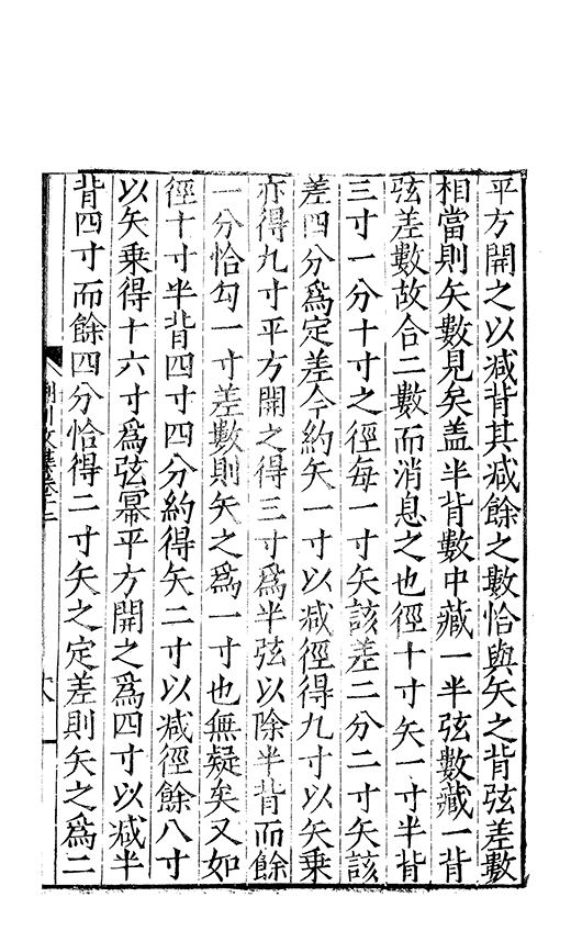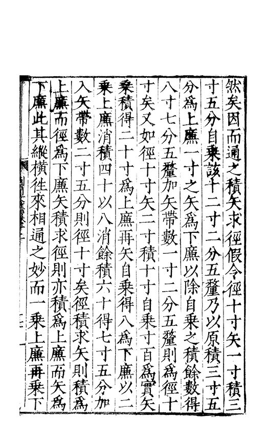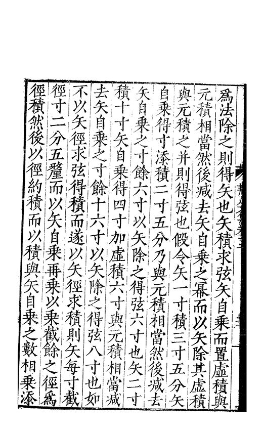 然矣因而通之積矢求徑假令徑十寸矢一寸積三寸五分自乗該十二寸二分五釐乃以原積三寸五分為上廉一寸之矢為下廉以除自乗之積餘數得八寸七分五釐加矢帶數一寸二分五釐則為徑十寸矣又如徑十寸矢二寸積十寸自乗寸百為實矢乗積得二十寸為上廉再矢自乗得八為下廉以二乗上廉消積四十以八消餘積六十得七寸五分加入矢帶數二寸五分則徑十寸矣徑積求矢則積為上廉而徑為下廉矢積求徑則亦積為上廉而矢為下廉此其縱横徃來相通之妙而一乗上廉再乗下