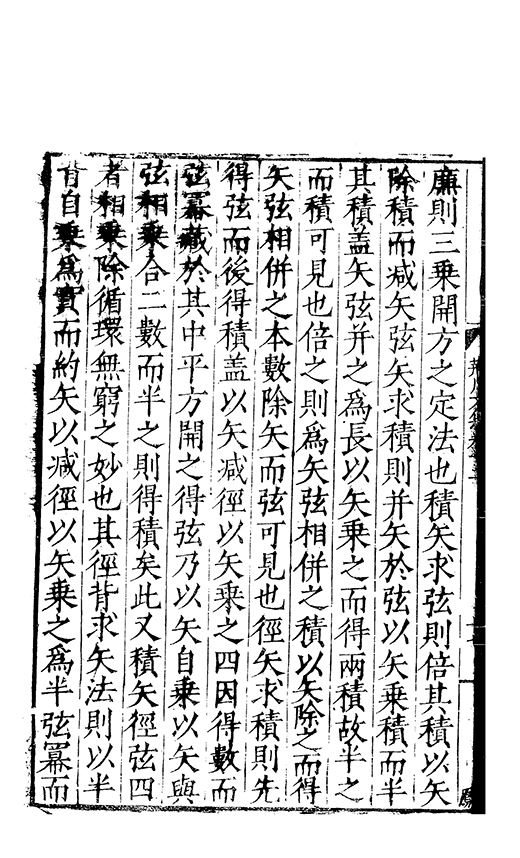 廉則三乗開方之定法也積矢求弦則倍其積以矢除積而减矢弦矢求積則并矢於弦以矢乗積而半其積盖矢弦并之為長以矢乗之而得兩積故半之而積可見也倍之則為矢弦相併之積以矢除之而得矢弦相併之本數除矢而弦可見也徑矢求積則先得弦而後得積盖以矢减徑以矢乗之四因得數而弦冪藏於其中平方開之得弦乃以矢自乗以矢與弦相乗合二數而半之則得積矣此又積矢徑弦四者相乗除循環無窮之妙也其徑背求矢法則以半背自乗為實而約矢以减徑以矢乗之為半弦冪而