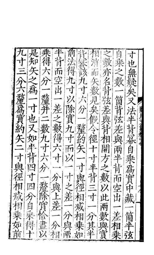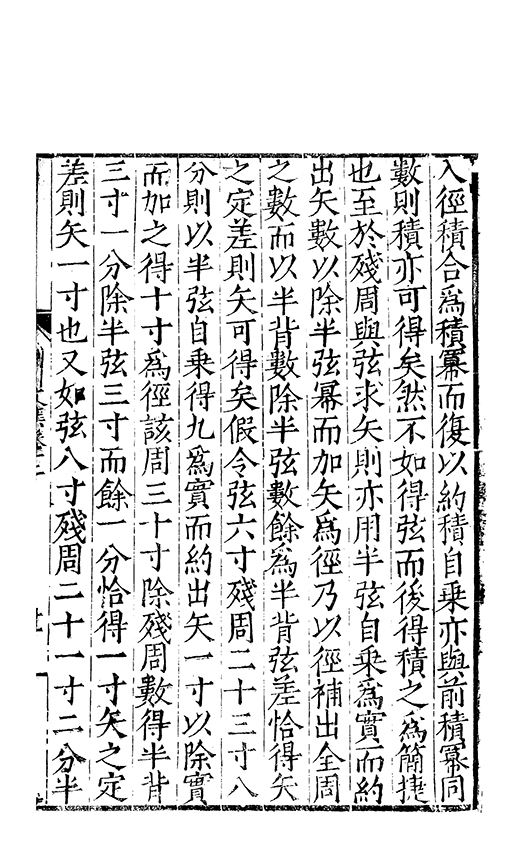 入徑積合為積冪而復以約積自乗亦與前積冪同數則積亦可得矣然不如得弦而後得積之為簡捷也至於殘周與弦求矢則亦用半弦自乗為實而約出矢數以除半弦冪而加矢為徑乃以徑補出全周之數而以半背數除半弦數餘為半背弦差恰得矢之定差則矢可得矣假令弦六寸殘周二十三寸八分則以半弦自乗得九為實而約出矢一寸以除實而加之得十寸爲徑該周三十寸除殘周數得半背三寸一分除半弦三寸而餘一分恰得一寸矢之定差則矢一寸也又如弦八寸殘周二十一寸二分半