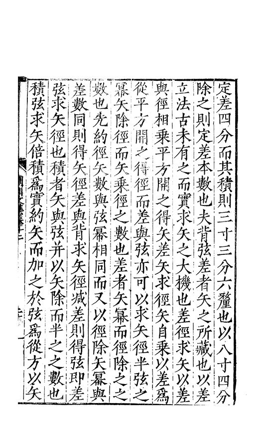 定差四分而其積則三寸三分六釐也以八寸四分除之則定差本數也夫背弦差者矢之所藏也以差立法古未有之而實求矢之大機也差徑求矢以差與徑相乗平方開之得矢差矢求徑矢自乗以差爲從平方開之得徑而差與弦亦可以求矢徑半弦之冪矢除徑而矢乗徑之數也差者矢冪而徑除之之數也先約徑矢數與弦冪相同而又以徑除矢冪與差數同則得矢徑差與背求矢徑减差則得弦即差弦求矢徑也積者矢與弦并以矢除而半之之數也積弦求矢倍積為實約矢而加之於弦為從方以矢