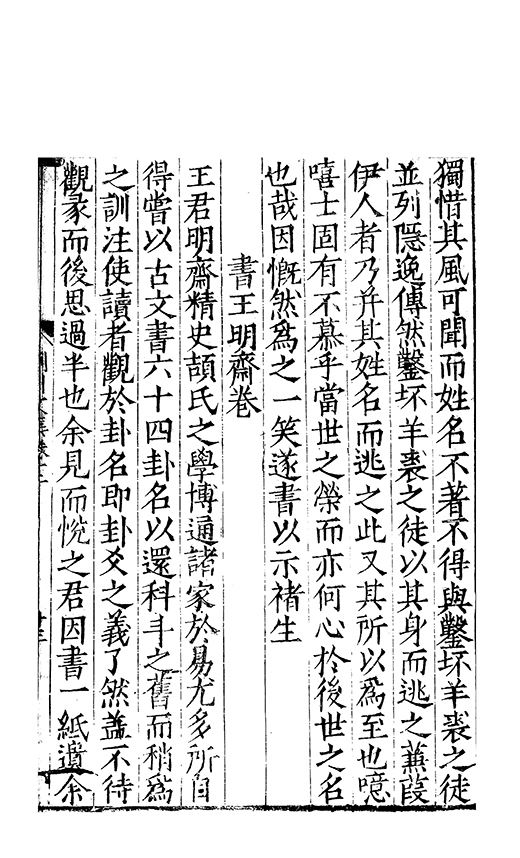 王君明齋精史頡氏之學博通諸家於易尤多所自得嘗以古文書六十四卦名以還科斗之舊而稍爲之訓注使讀者觀於卦名即卦爻之義了然盖不待觀彖而後思過半也余見而恱之君因書一紙遺余