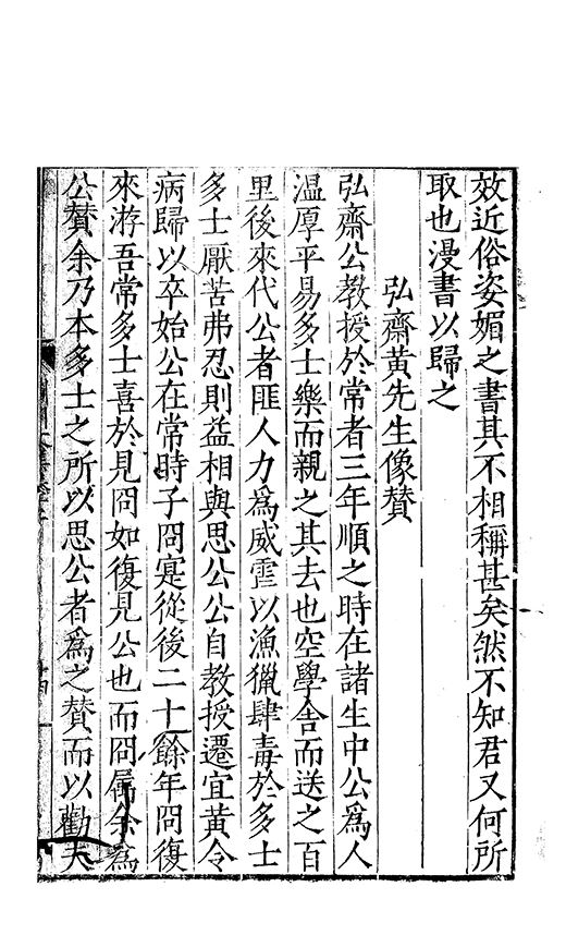 弘齋公教授於常者三年順之時在諸生中公爲人温厚平易多士樂而親之其去也空學舎而送之百里後來代公者匪人力爲威虐以漁獵肆毒於多士多士厭苦弗忍則益相與思公公自教授遷宜黄令病歸以卒始公在常時子冏寔從後二十餘年冏復來游吾常多士喜於見冏如復見公也而冏属余爲公賛余乃本多士之所以思公者為之賛而以勸夫