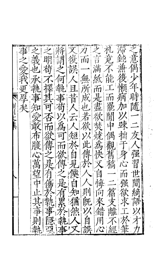 之意偶少年時隨一二友人强習世間綺語以才力滯鈍兼復懶病加以疎拙於身心而强欲求工於筆札竟不能工而罷閒中偶觀舊稿一二篇支離不經之言滿紙而是盡欲焚燒爲快又自悔向來錯用心力而一無所成也若欲以此傳於人人則旣以自誤又復誤人且昔人云人短於自見僕自知猶然人又將謂之何執事苟以爲可而欲傳之是有累於執事之明苟不擇其可否而欲傳之是有傷於執事隱惡之義也承執事知愛敢布腹心萬望中止其事則執事之愛我更厚矣