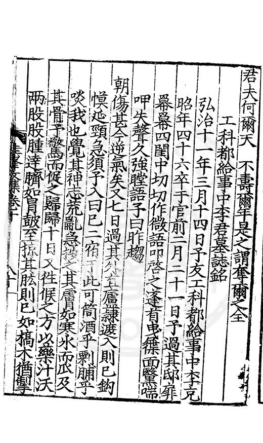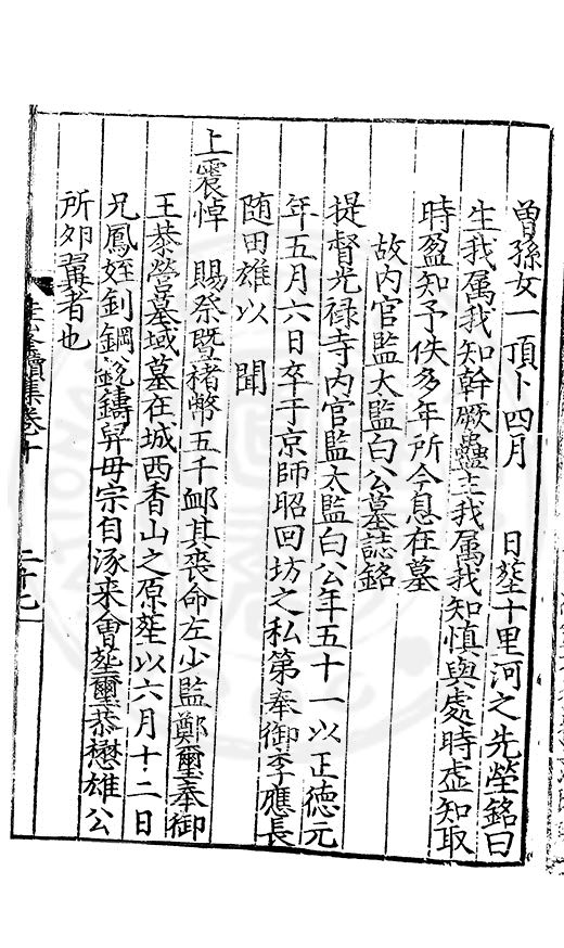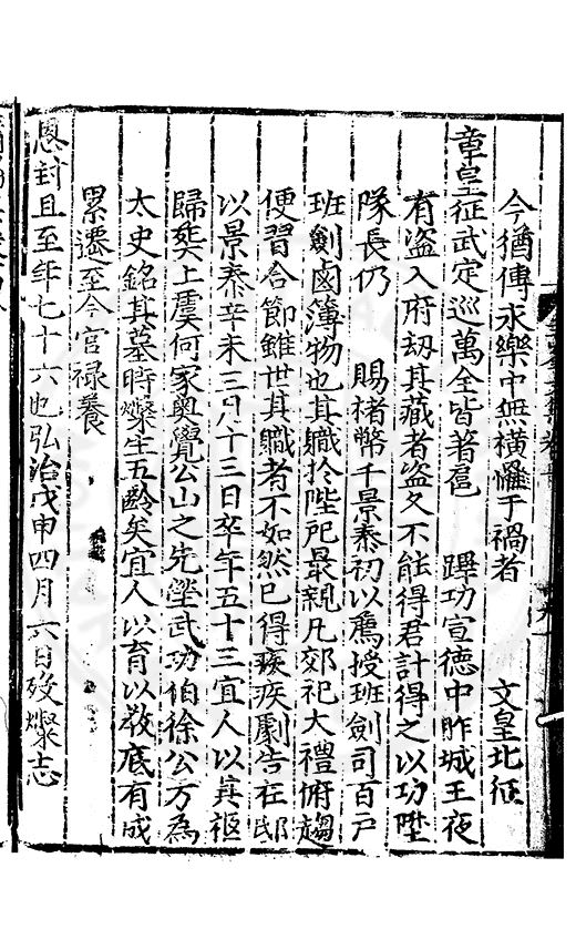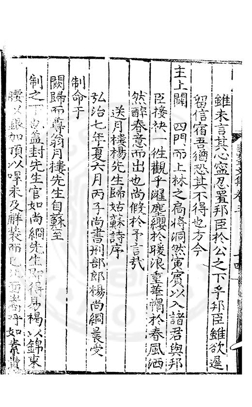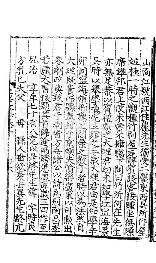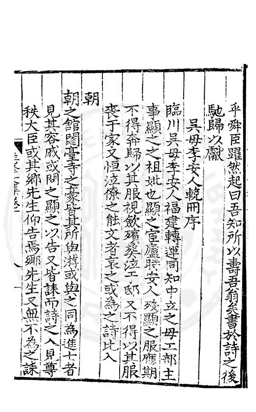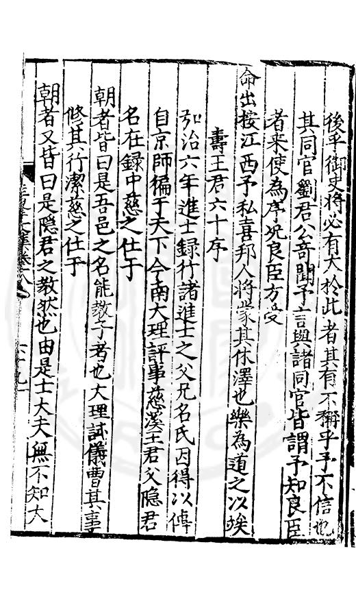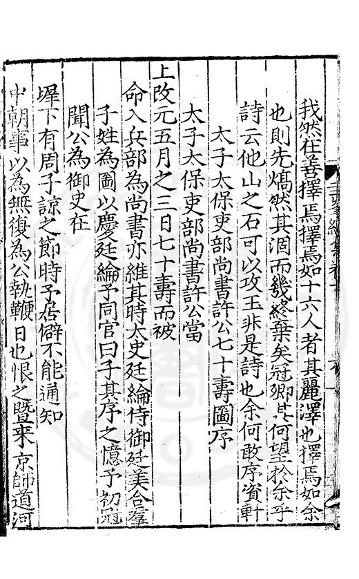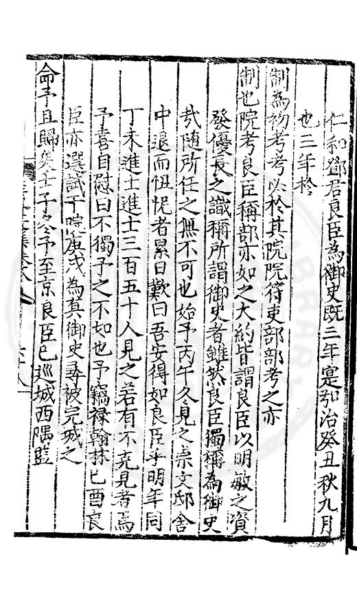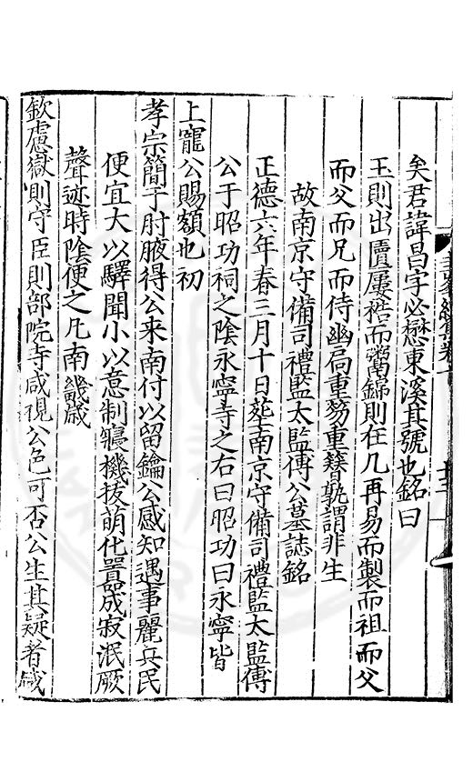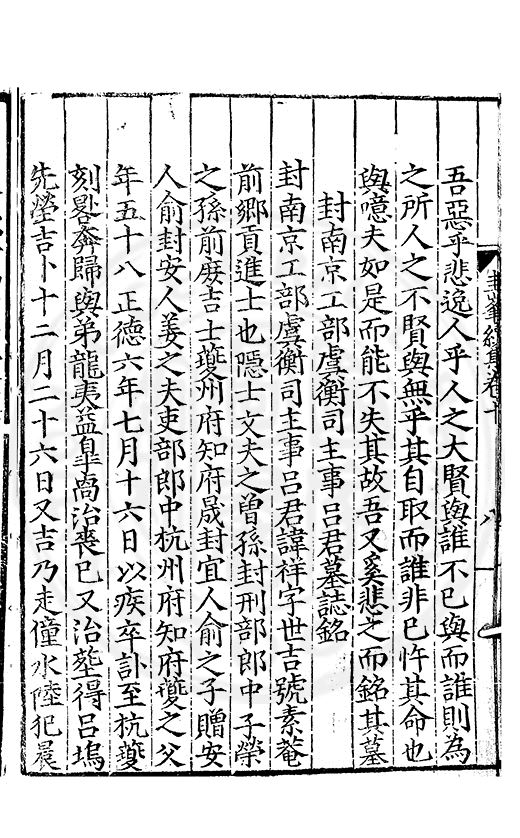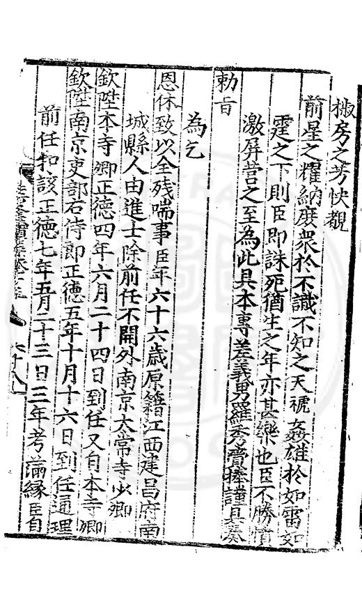 為乞恩休致以全殘喘事臣年六十六歳原籍江西建昌府南城縣人由進士除前任不開外南京太常寺少卿欽陞本寺卿正徳四年六月二十四日到任又自本寺卿欽陞南京吏部右侍郎正徳五年十月十六日到任通理前任扣該正徳七年五月二十三日三年考滿縁臣自