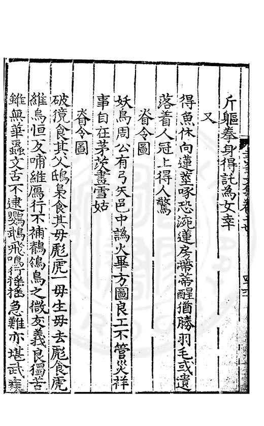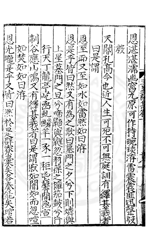 白霧下赤壁素月篩青林風露變草木魚鳥觧晴隂蛟潭湛潏潏鷗波去沉沉島嶼上下勢舟船來去心此亭對此景一鶴與一琴琴音諧韶護鶴性甘蕭森春濃十里竹秋静萬家砧象罔溟蒙合雲雷屯伏深主人葛天氏不信有朝簮