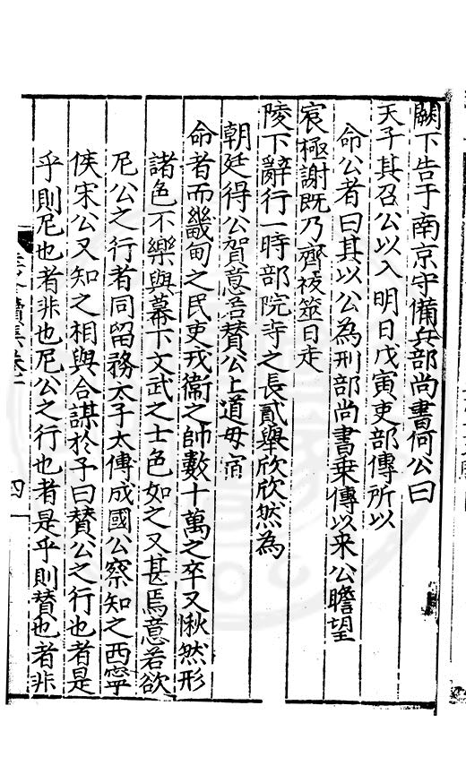邏地靣傳來流賊執殺右副都御史馬炳然臣初疑似之間以為副都御史九卿之二也且非受命征勦之不過遇之而巳而輙殺之則九卿之長遇之必殺也九卿之長敢殺之則公侯駙馬伯遇之必殺也是尚知有朝廷威令哉而朝廷左右尚為有人乎而臣亦俻員九卿之貳亦在賊必殺之中誓當不與此賊俱生賊生臣死賊死臣生也亦痛夫國本之未定而睥睨之萌漸不可遏巳至此也然尚断然不信傳來之言忽扵今月十三日申刻迎接炳然