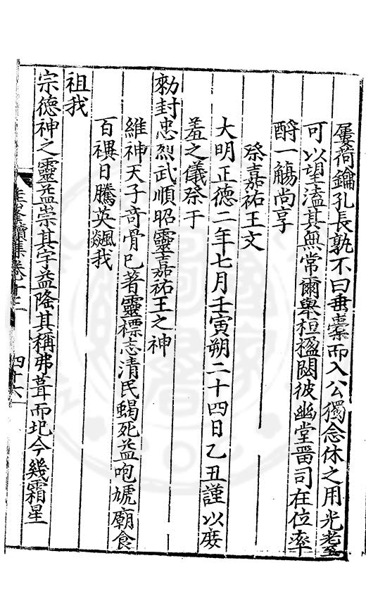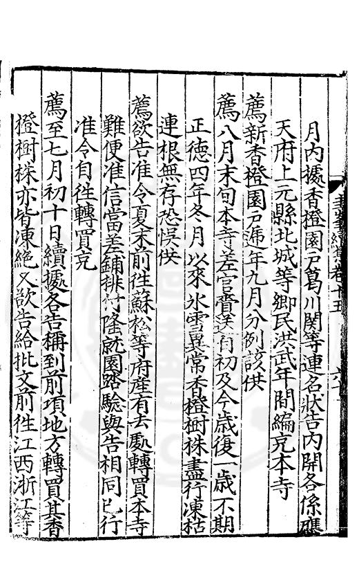 月内據香橙園戸葛川関等連名狀告内開各係應天府上元縣北城等郷民洪武年間編充本寺薦新香橙園戸逓年九月分例該供薦八月末旬本寺差官賫送自初及今歳復一歳不期正徳四年冬月以來氷雪異常香橙樹株盡行凍枯連根無存恐悞供