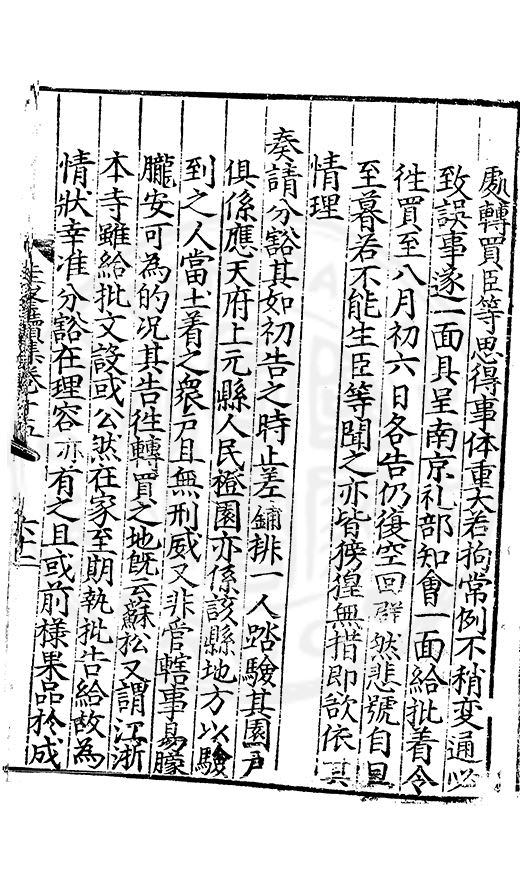處轉買臣等思得事体重大若拘常例不稍变通必致誤事遂一面具呈南京礼部知會一面給批着人徃買至八月初六日各告仍復空回群然悲號自旦至暮若不能生臣等聞之亦皆徬徨無措即欲依其情理奏請分豁其如初告之時止差鋪排一人踏驗其園戸俱係應天府上元縣人民橙園亦係該縣地方以驗到之人當土着之衆戸且無刑威又非管轄事易朦朧安可為的况其告徃轉買之地旣云蘇松又謂江浙本寺雖給批文設或公然在家至期執批告給故為情狀幸准分豁在理容亦有之且或前様果品扵成