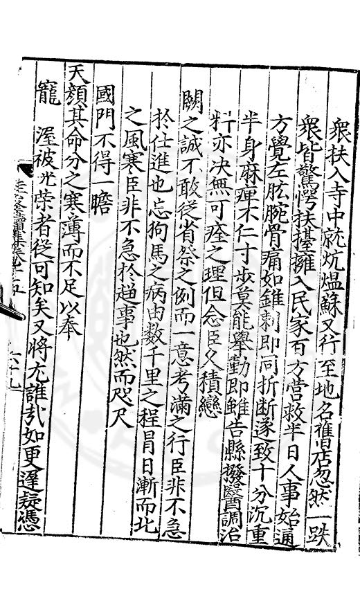 衆扶入寺中就炕煴蘇又行至地名舊店忽然一跌衆皆驚愕扶擡擁入民家百方营救半日人事始通方覺左肱腕骨痛如錐剌即同折断遂致十分沉重半身麻痺不仁寸歩莫能舉動即雖告縣撥醫調治料亦决無可痊之理但念臣乆積戀闕之誠不敢從省祭之例而一意考滿之行臣非不急扵仕進也忘狗馬之病由数千里之程冐日漸而北之風寒臣非不急扵趋事也然而咫尺國門不得一瞻天顔其命分之寒薄而不足以奉寵 渥被光荣者從可知矣又將尤誰哉如更遅疑憑