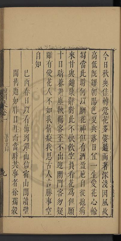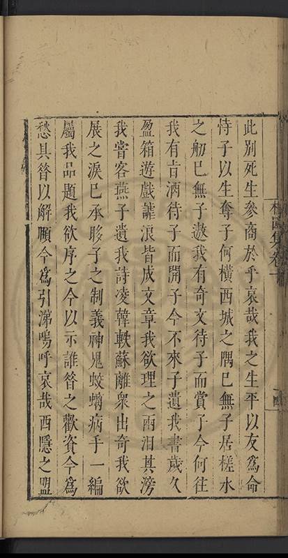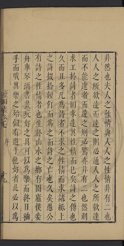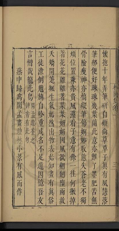 詩亦徃徃過稱之以此稍復自信生平徃來燕齊及遨遊吳越山水閒見夫林泉氣狀英淑恠麗與夫風塵車馬之跡人世菀枯之感雜然有動於中每五七其句讀平上其音節而為詩年來將母十畆退而灌園朋舊過從發憤時事和汝唱余篇什稍多然皆出於已而不丐於古於凡格律正變古今人所句爭而字辯之者終不能窺其堂奧也至於古文益率意為之無所祖述閒復癖懶中廢不及成篇故其所存自序述