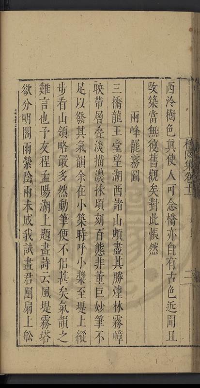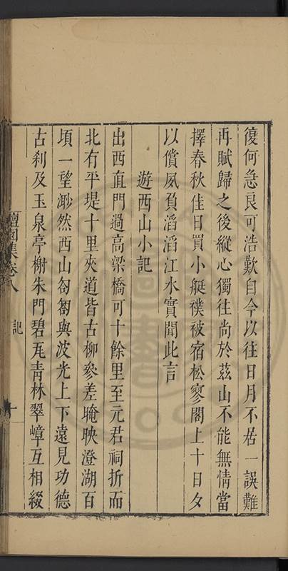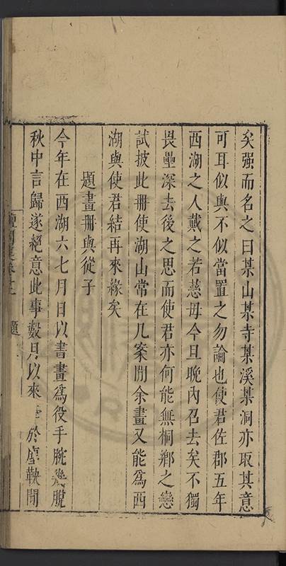 者之前也公治杭未三年而政成人和廢墜修舉比者清湖之役不避豪右斷而行之使空朙瀲灔還其舊觀泳游呴沬皆荷朙徳論者以為白蘇復生而余亦謂公之風流節概未可以今人中求之也上下千餘年西湖為白蘇兩人所有後之人安得而有之今則又當屬之公矣如余所畫庾公南樓謝公東山及其他名勝之地未有不因其人以傳者也余他日㪅請為公圖西湖之勝以繼古人之後可乎余畫雖不工固