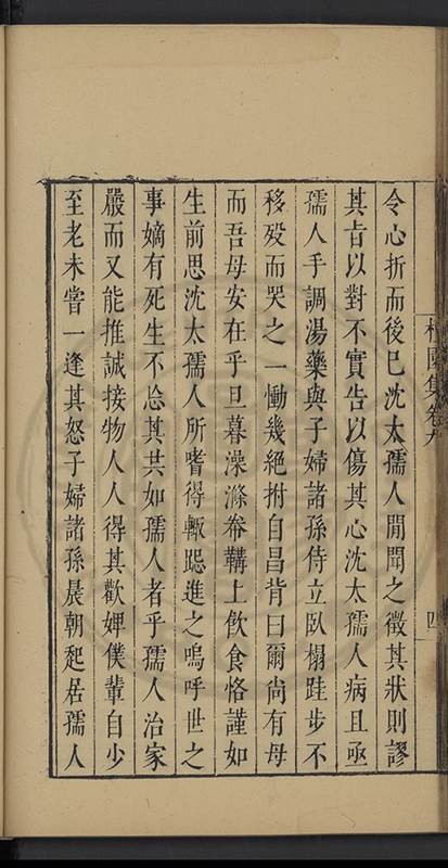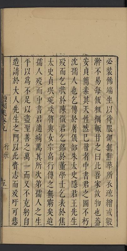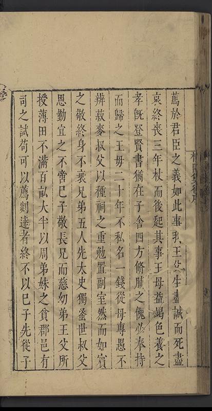 篤於君臣之義如此事我王父生盡誠而死盡哀終䘮三年杖而後起其事王母益竭色養之孝既登賢書猶在子舎四方脩脯之餽必奉持而歸之王母二十年不私名一錢從母專愚不辨菽麥叔父以種祠之重勉置副室然而如賔之敬終身不衰兄弟五人先太史獨蚤世叔父思勤宜之不啻已子敬長兄而慈幼分王父所授薄田不滿百畆大半以周弟妹之貧郡邑有司之試苟可以薦剡達者終不以已子先從子