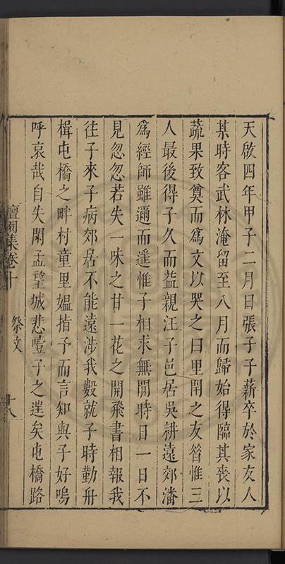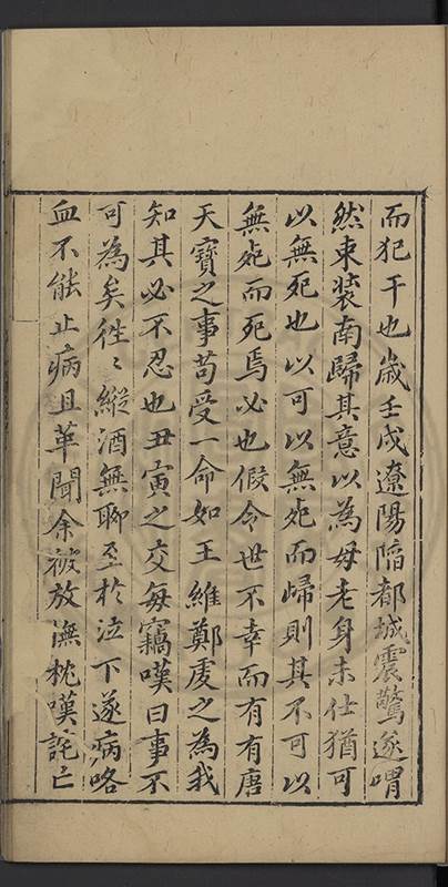 而犯干也嵗壬戌遼陽䧟都地震驚遂喟然束裝南歸其意以為毋老身未仕猶可以無死也以可以無苑而㱕則其不可以無苑而死焉必也假令世不幸而有有唐天寶之事苟受一命如王維鄭䖍之為我個其必不忍也丑寅之交每竊嘆曰事不可為矣徃徃縱酒無聊至扵泣下遂病咯血不能止病且革聞余被放撫枕嘆詫亡