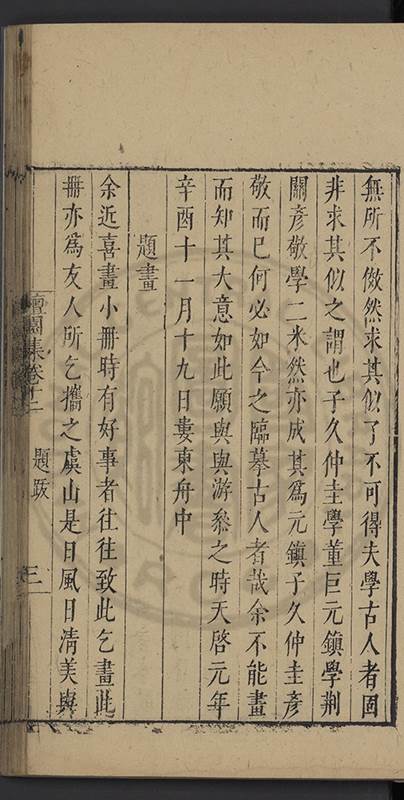 竭慮亦何能繪畫日月之萬一雖然此叔父意也其何敢辭秉筆硯縷亦𦖂以伸叔父之意云爾崇禎二年歲已已元夕後五日猶子宜之僅序