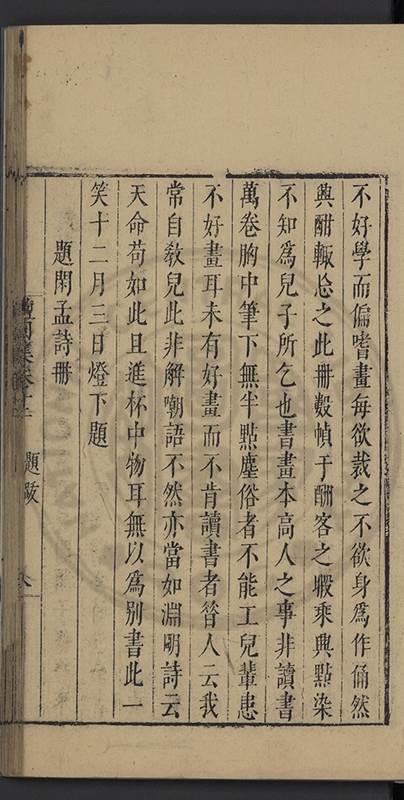 有酬應非其所樂臘月自吳門還連日陰翳門無剝啄頗有紙窻竹屋之致偶簡得從子緇仲所乞高麗繭冊連畫得十二幀或挑燈酒闌雜以夣境或映簷呵凍盥櫛都㤀人生閒適之味不可多得至於筆墨適意尤難吾不知此畫方之作者工拙若何然其胸懷所寄不受促逼或亦不當以工拙目之矣天啓甲子嘉平月慎娛居士題