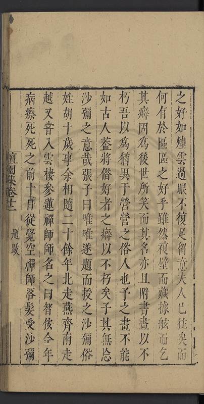 之好如𤎆雲過眼不復足留意夫人已往矣而何有於區區之好乎雖然複壁而藏據舷而乞其癖固為後世所笑而其名亦且附書畫以不朽吾以為猶異于營營之俗人也予之畫不能如古人葢將𠎥好者之癖以不朽矣子其無㤀沙彌之意哉張子曰唯唯遂題而授之沙彌俗姓胡十歲事余相隨二十餘年北走燕齊南走越又𡮢入雲棲參蓮禪師師名之曰智侒今年病瘵死死之前十日從覺空禪師落髪受沙彌