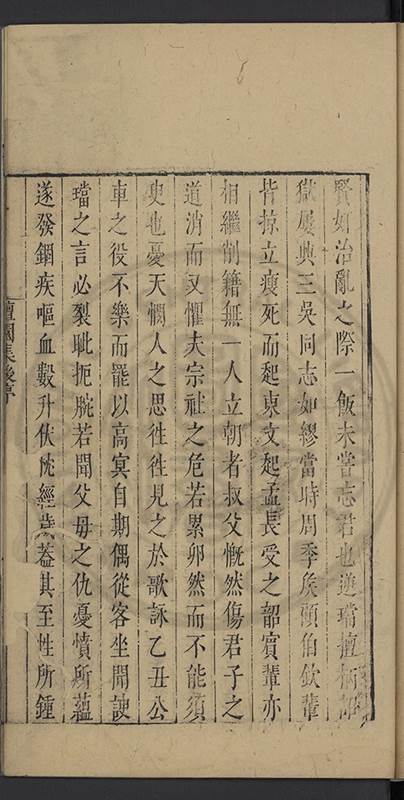賢 治亂之際一飯未𡮢忘君也逆 擅栢 獄屢與三吳同志如繆當時周季矦顧伯欽輩皆掠立瘦死而起東文起孟長受之韶賔輩亦相繼削籍無一人立朝者叔父慨然傷君子之道消而又懼夫宗社之危若累卯然而不能須臾也憂天憫人之思徃徃見之於歌詠乙丑公車之役不樂而罷以高㝠自期偶從客坐閒䛕璫之言必裂眦扼腕若聞父母之仇憂憤所蘊遂發錮疾嘔血數升伏枕經歲葢其至徃所鐘
