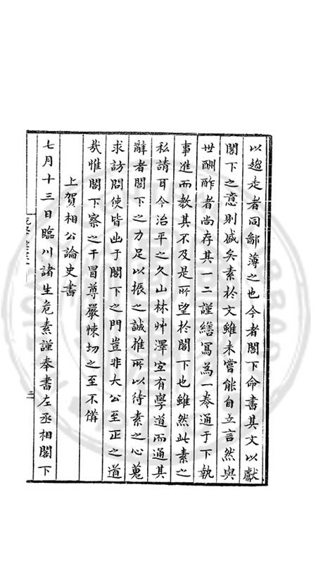 七月十三日臨川諸生危素謹奉書左丞相閣下