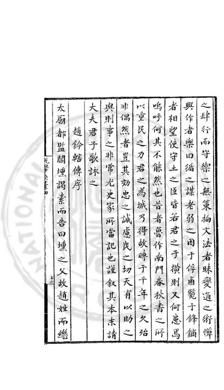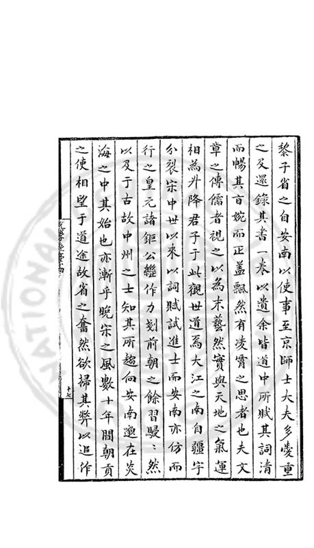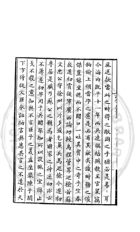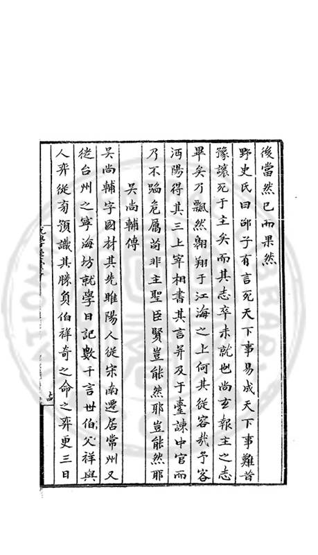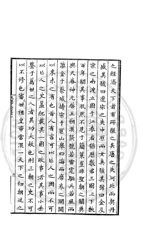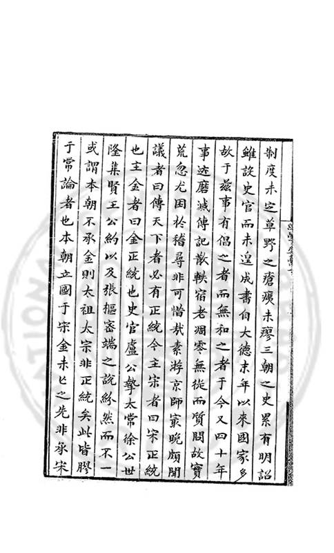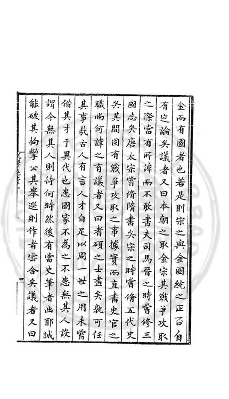 金而有國者也若是則宋之與金國統之正否自有㝎論矣議者又曰本朝之取金宋其戰争攻取之際當有所諱而不敢書夫司馬晉之時嘗修三國志矣唐太宗嘗脩隋書矣宋之時嘗脩五代史矣其間固有戰争攻取之事據實而直書史官之職尚何諱之有議者又曰耆頸之士畫矣孰可任其事哉古人有言人才自足以周一世之用未嘗借其才于異代也患國家不為之不患無其人設謂今無其人則待何時然後有當史筆者出耶誠能破其拘攣公其舉選則作者雲合矣議者又曰