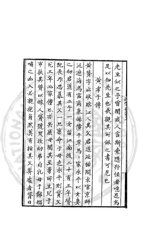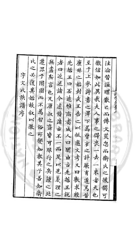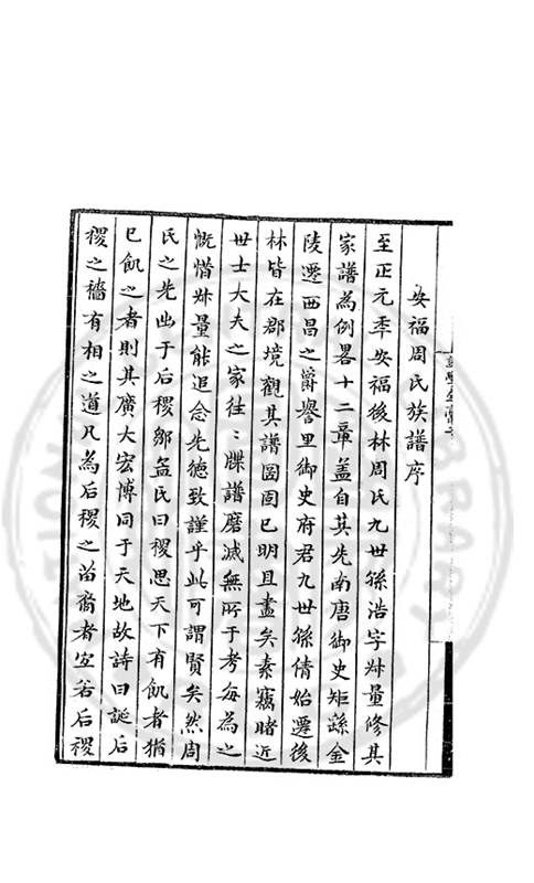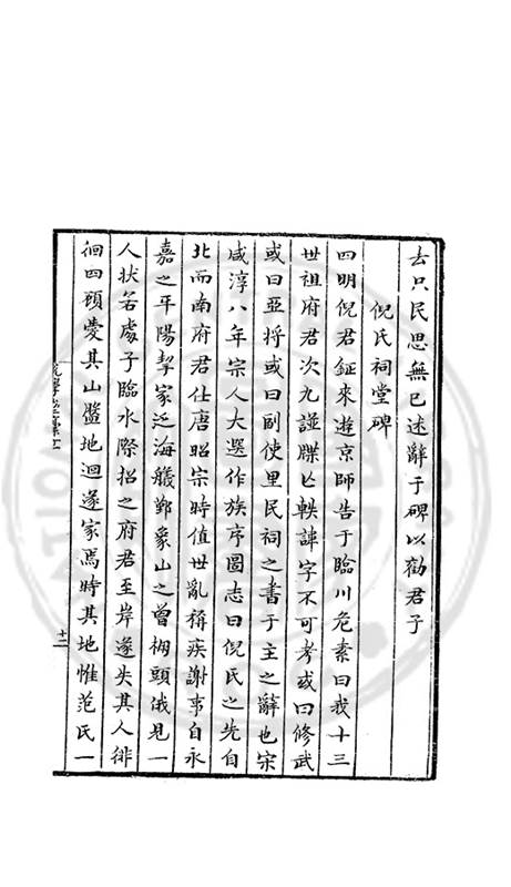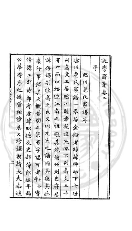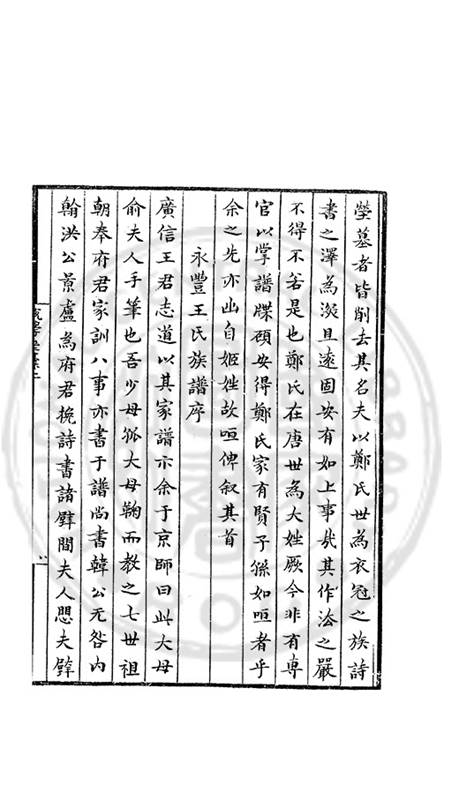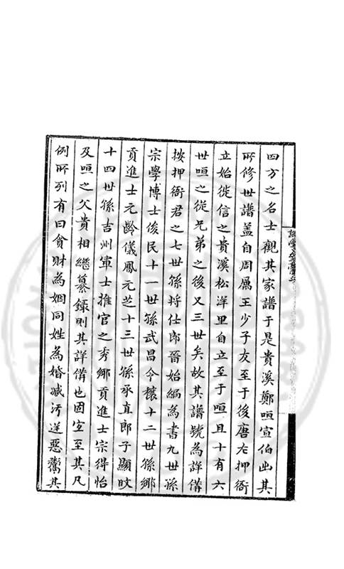 四方之名士觀其家譜于是貴溪鄭咺宣伯出其所修世譜盖自周厲王少子友至于後唐左押衙立始徙信之貴溪松洋里自立至于咺且十有六世咺之従兄弟之後又三世矣故其譜號為詳傋按押衙君之七世孫将仕郎晉始編為書九世孫宗學博士俊民十一世孫武昌令欀十二世孫鄊貢進士元齡儀鳳元芝十三世孫承直郎子顯旼十四世孫吉州軍士推官之秀鄉貢進士宗得怡及咺之父貴相繼纂録則其詳傋也固空至其凡例所列有曰貪財為姻同姓為婚藏污𨒫惡鬻其